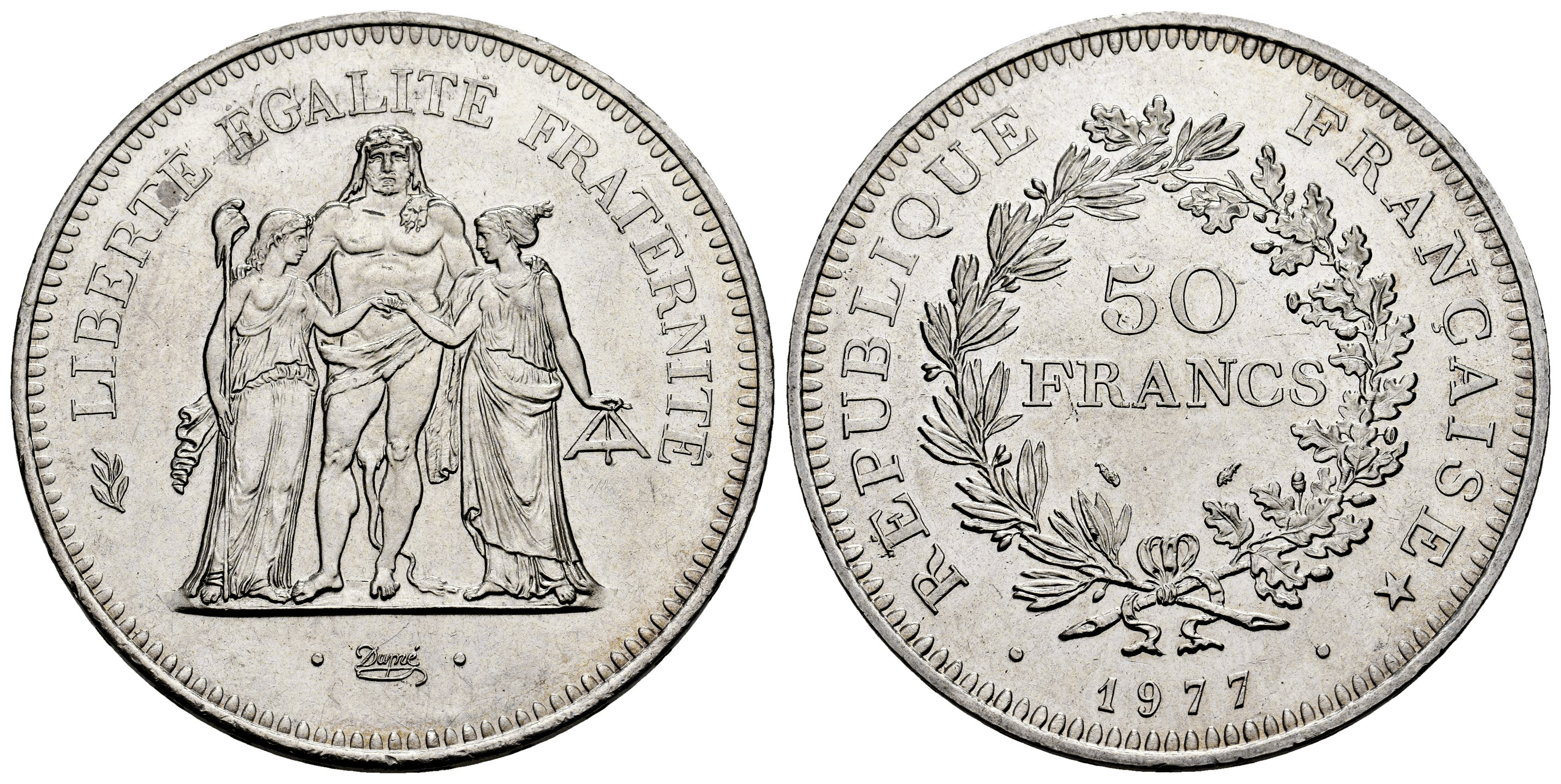 Francia. 50 francs. 1977. (Km-941.1). (Gad-882). Ag. 29,90 g. Pleno brillo original. SC. Est...35,00.