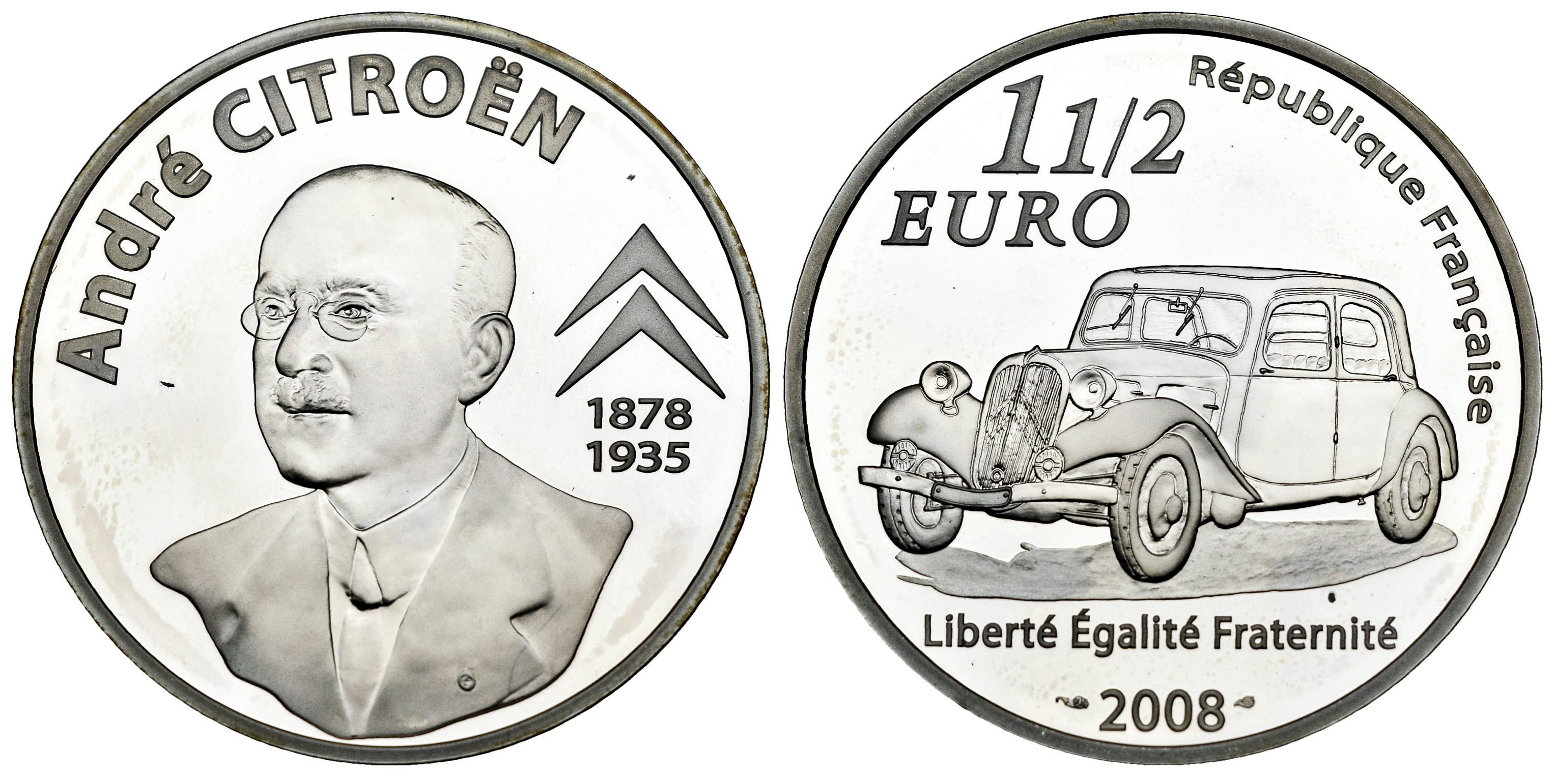 Francia. 1 1/2 euros. 2008. París. (Km-1555). (Gad-321). Ag. 22,40 g. 130º Aniversario de André Citroën. Con certificado oficial. PROOF. Est...25,00.