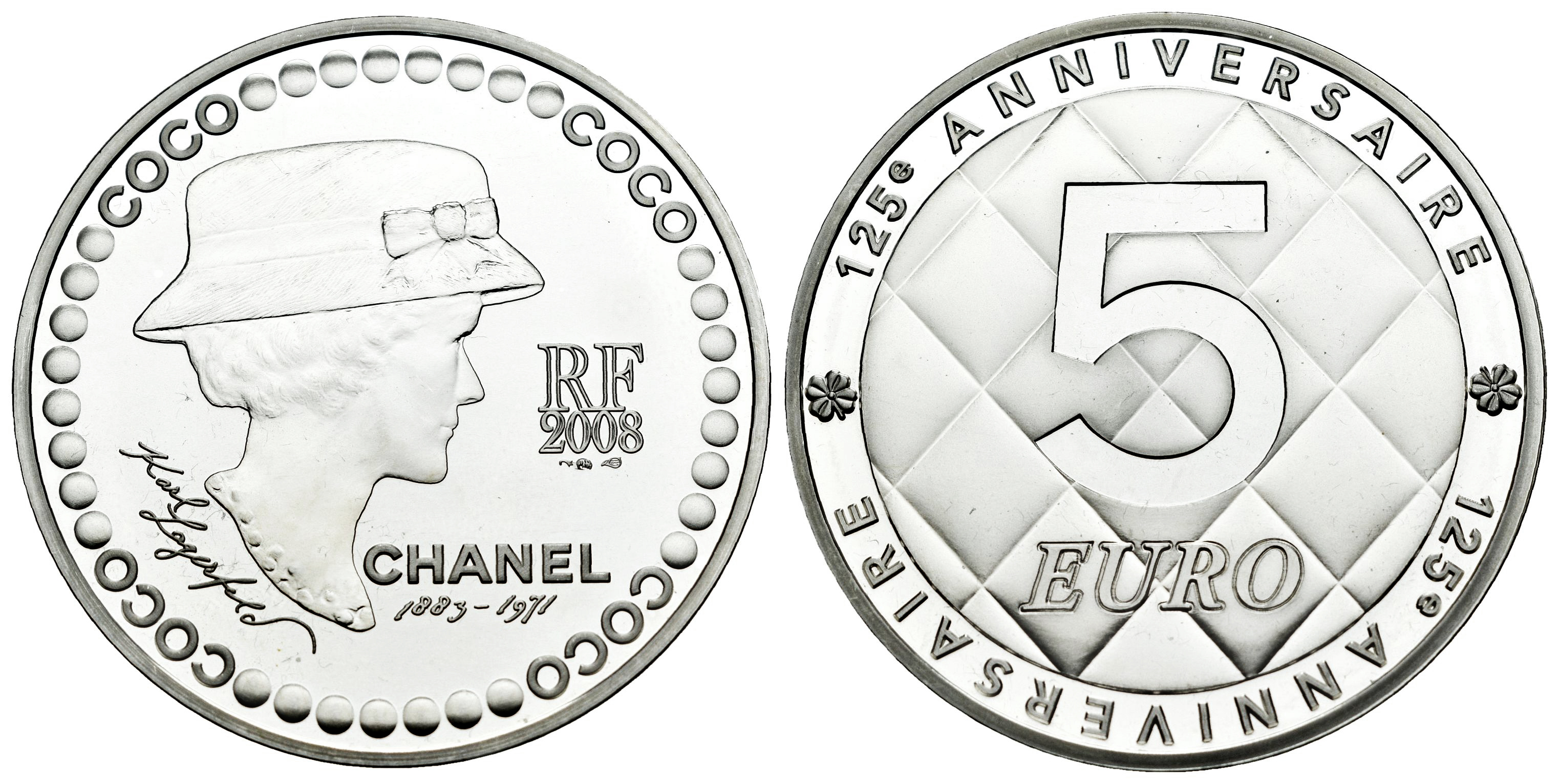 Francia. 5 euros. 2008. París. (Km-1566). (Gad-EURO#C298). Ag. 22,35 g. 125º Aniversario del Nacimiento de "Coco" Chanel. Con certificado oficial. PROOF. Est...35,00.
