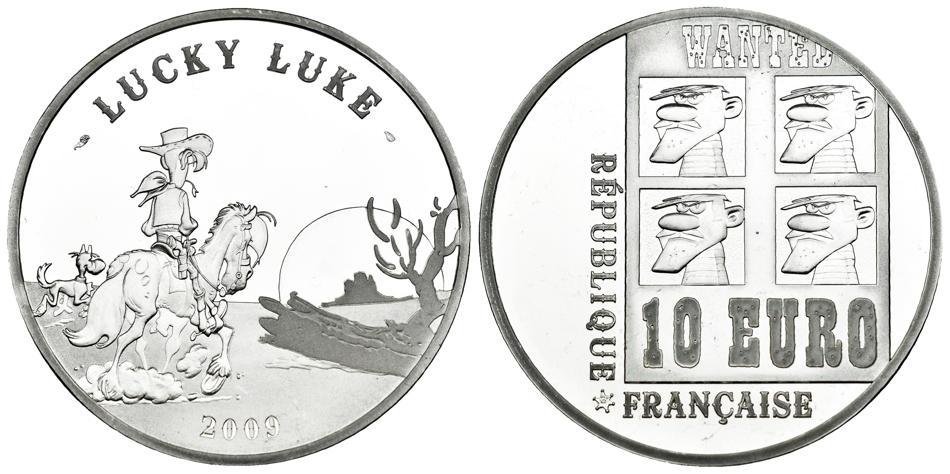 Francia. 10 euros. 2009. París. (Km-1629). (Gad-361). Ag. 22,23 g. Lucky Luke. Con certificado oficial. PROOF. Est...50,00.