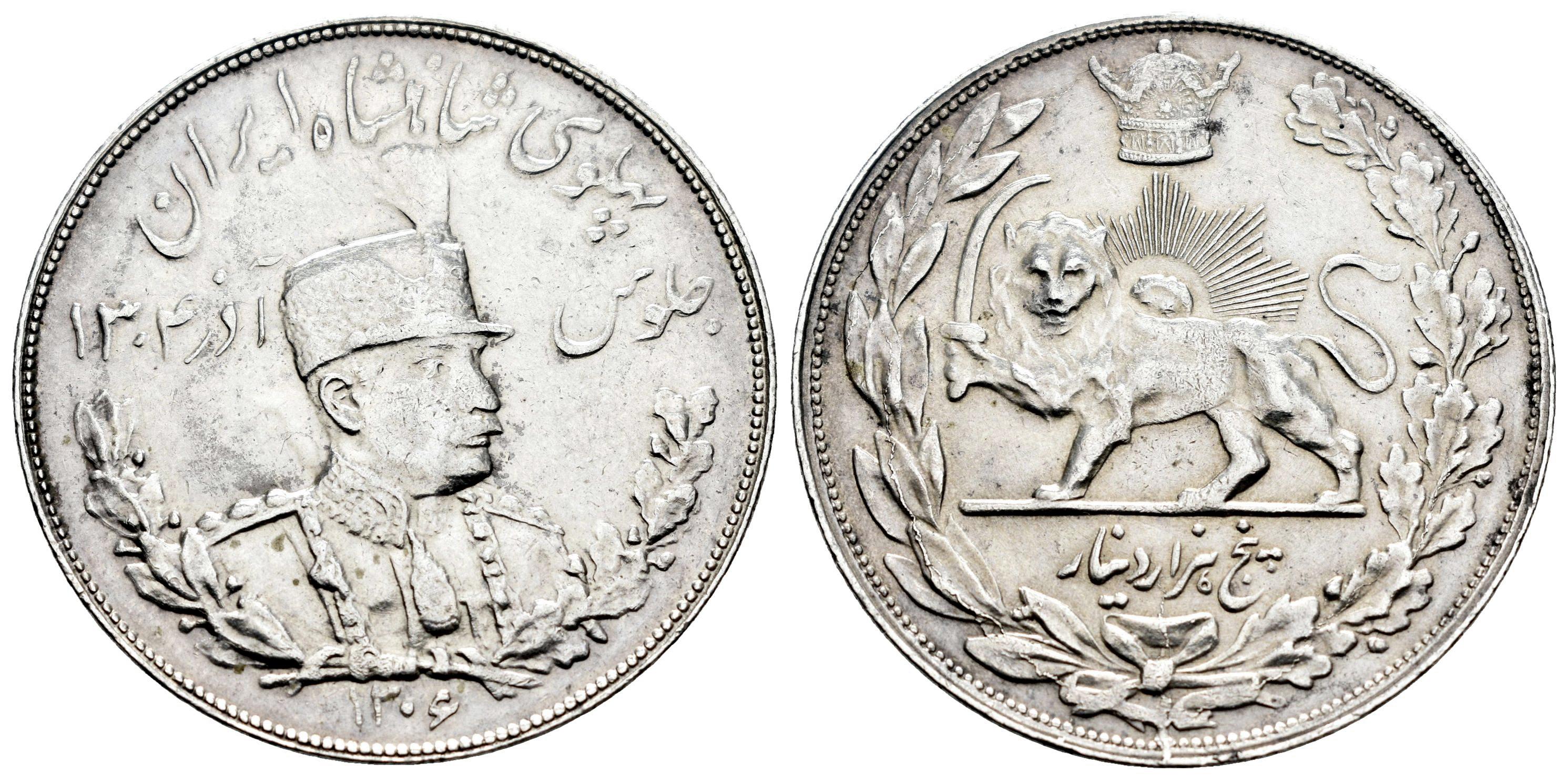 Irán. Mohammad Reza Palhevi. 5000 dinares. 1307 H (1928). (Km-1106). Ag. 23,54 g. Escasa. EBC-/EBC. Est...50,00.