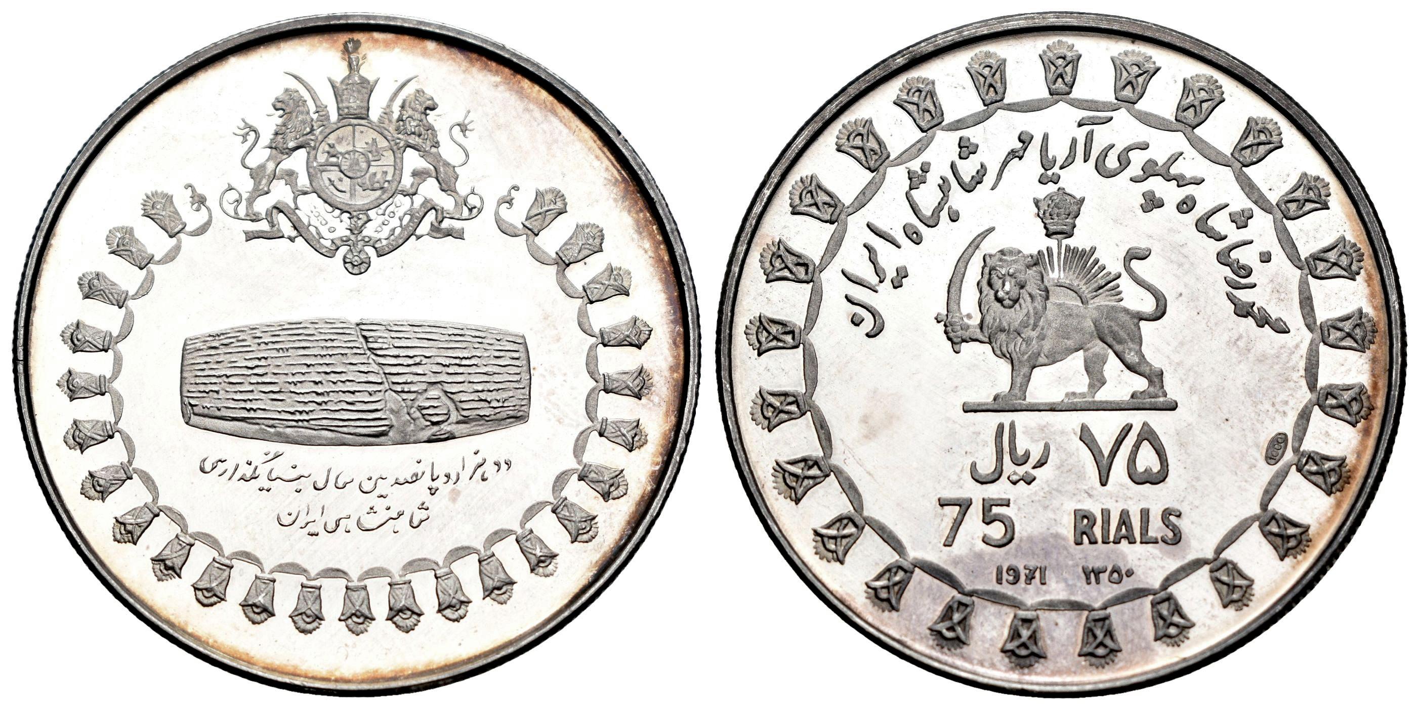 Irán. Mohammad Reza Palhevi. 75 rials. 1350 H (1971). (Km-1186). Ag. 22,75 g. 2500 Aniversario del Imperio Persa. Tirada de 18.000 piezas. PROOF. Est...25,00.