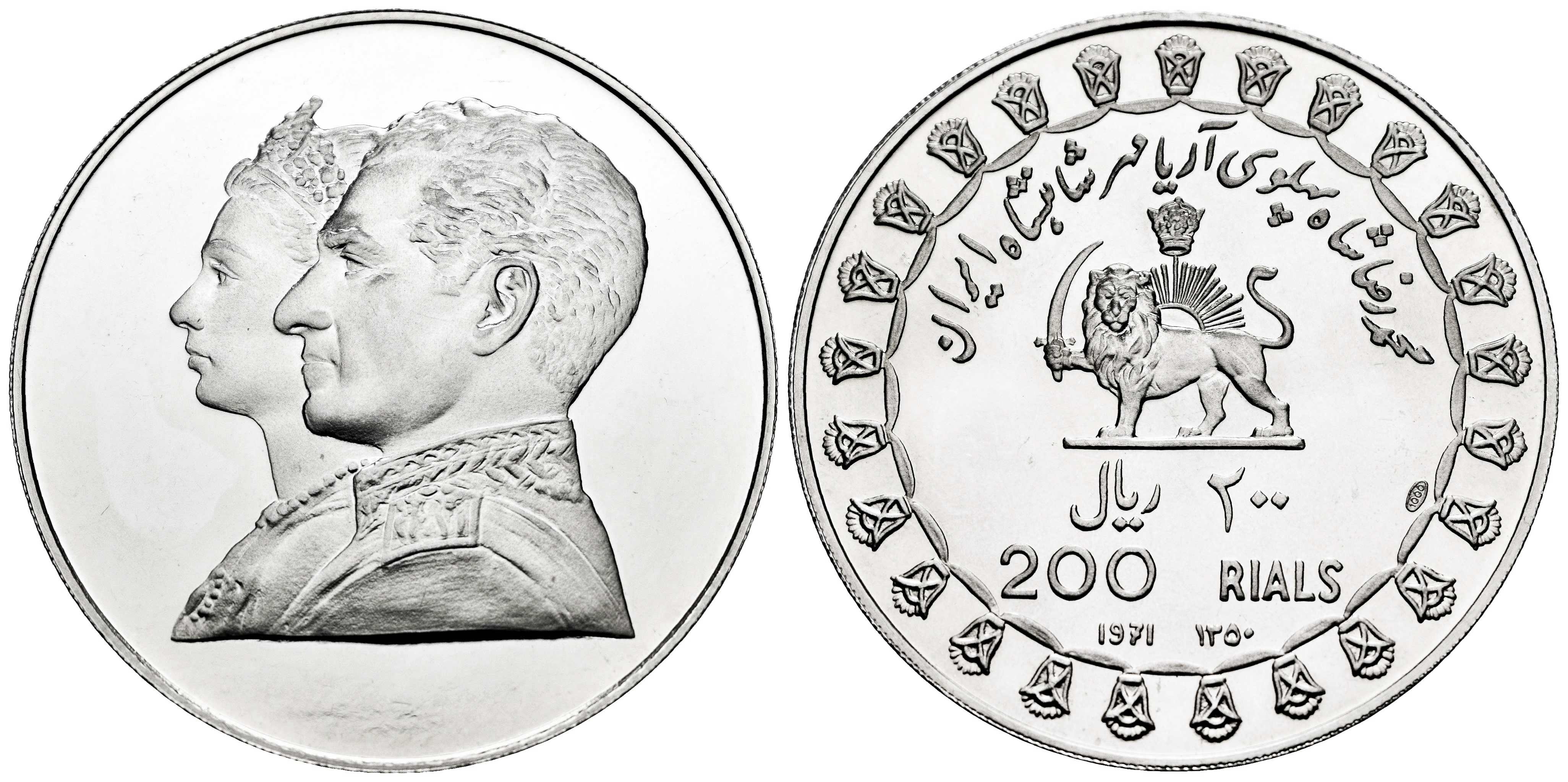 Irán. Mohammad Reza Palhevi. 200 Rials. 1350 H (1971). (Km-1188). Ag. 59,04 g. Conmemoración del 2500 aniversario del Imperio Persa. Rara. 50 mm. PROOF. Est...200,00.