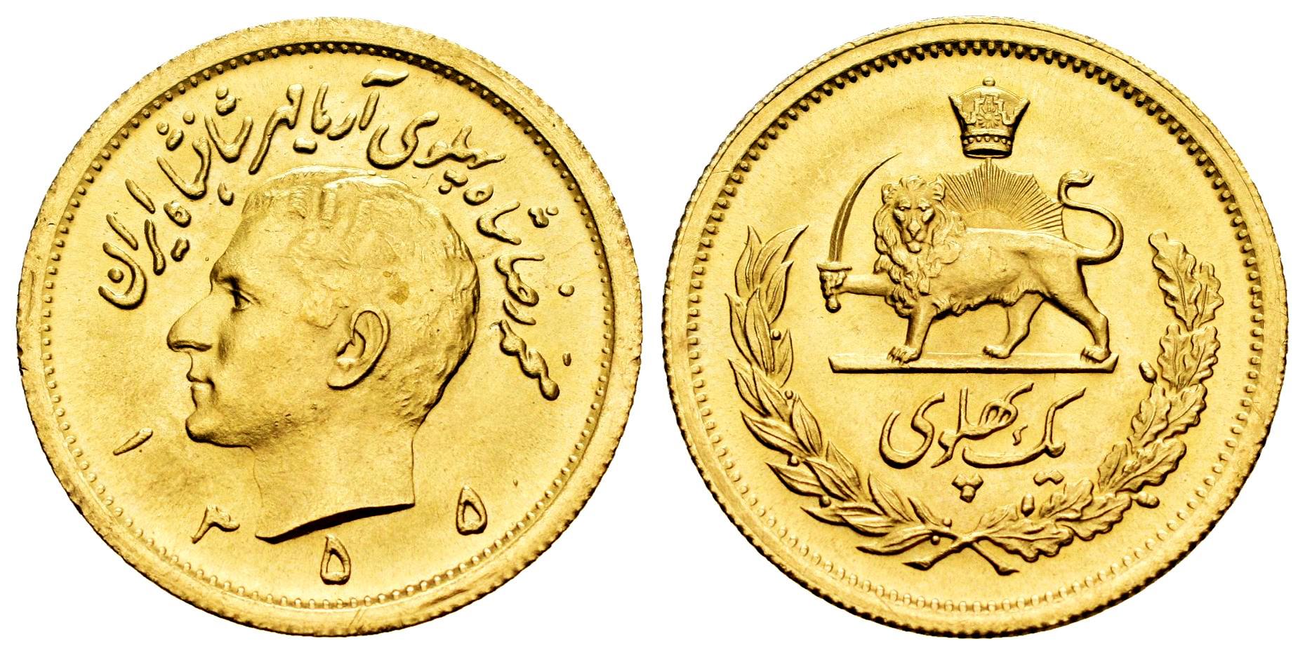 Irán. Mohammad Reza Palhevi. 1 pahlevi. 1355 H (1976). (Km-1200). (Fr-101). Au. 8,04 g. Brillo original. SC. Est...600,00.