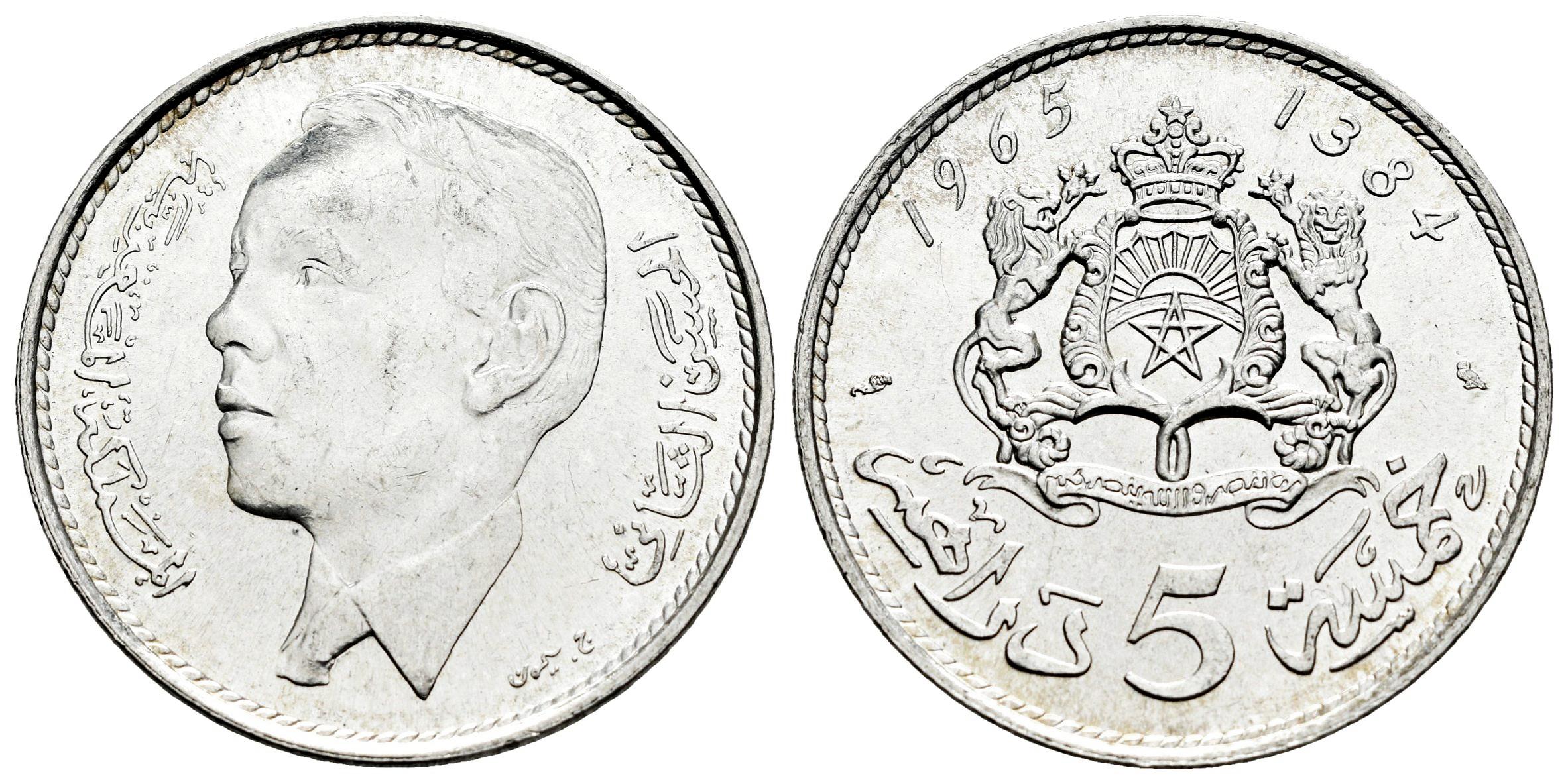 Marruecos. Hassan II. 5 dirhams. 1387 (1965). París. (Km-Y57). Ag. 11,78 g. Pleno brillo original. SC-/SC. Est...40,00.