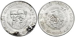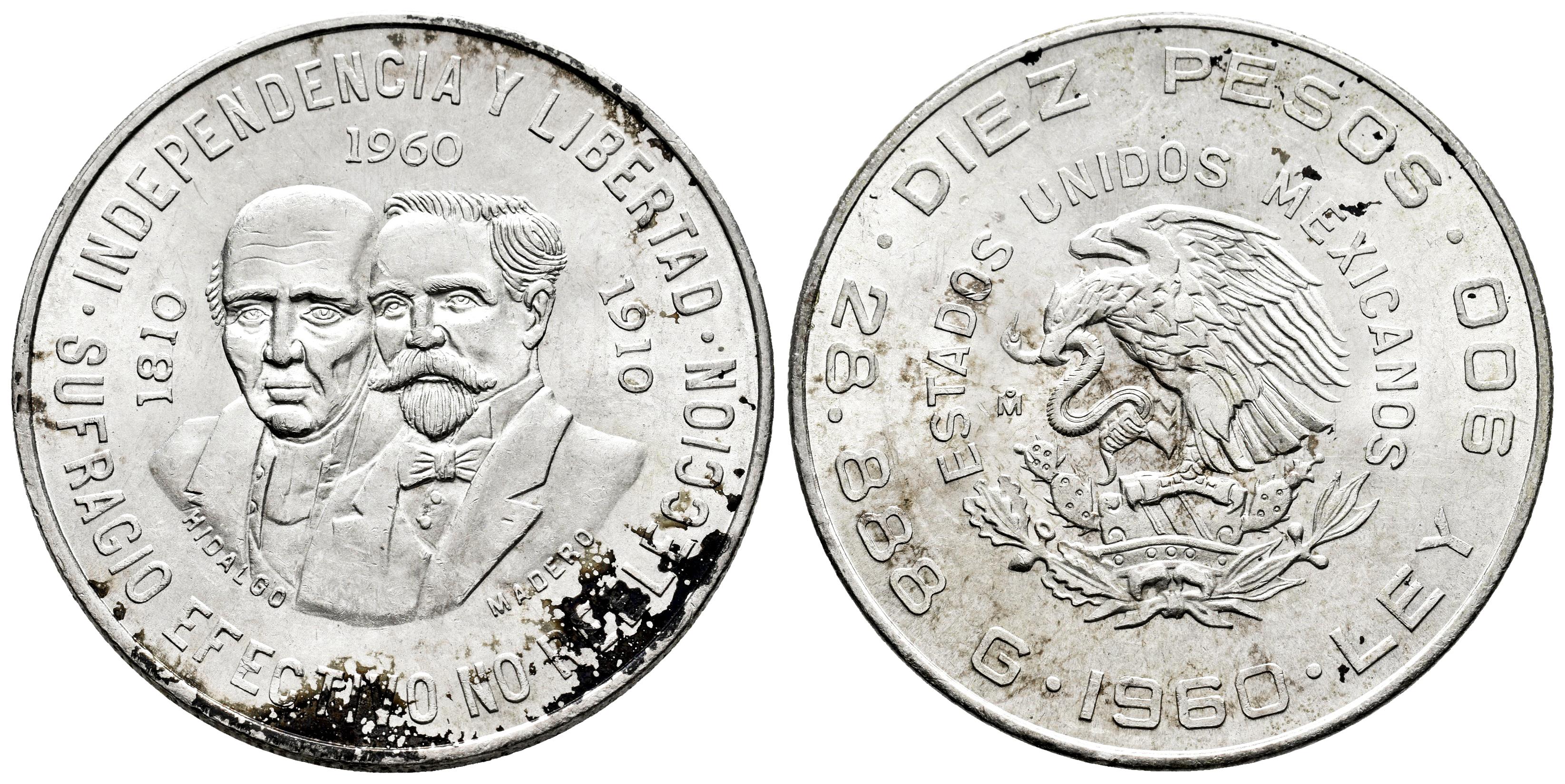 México. 10 pesos. 1960. México. (Km-476). Ag. 28,81 g.  150 Aniversario de la Independencia. Manchitas. Brillo original. EBC+. Est...45,00.