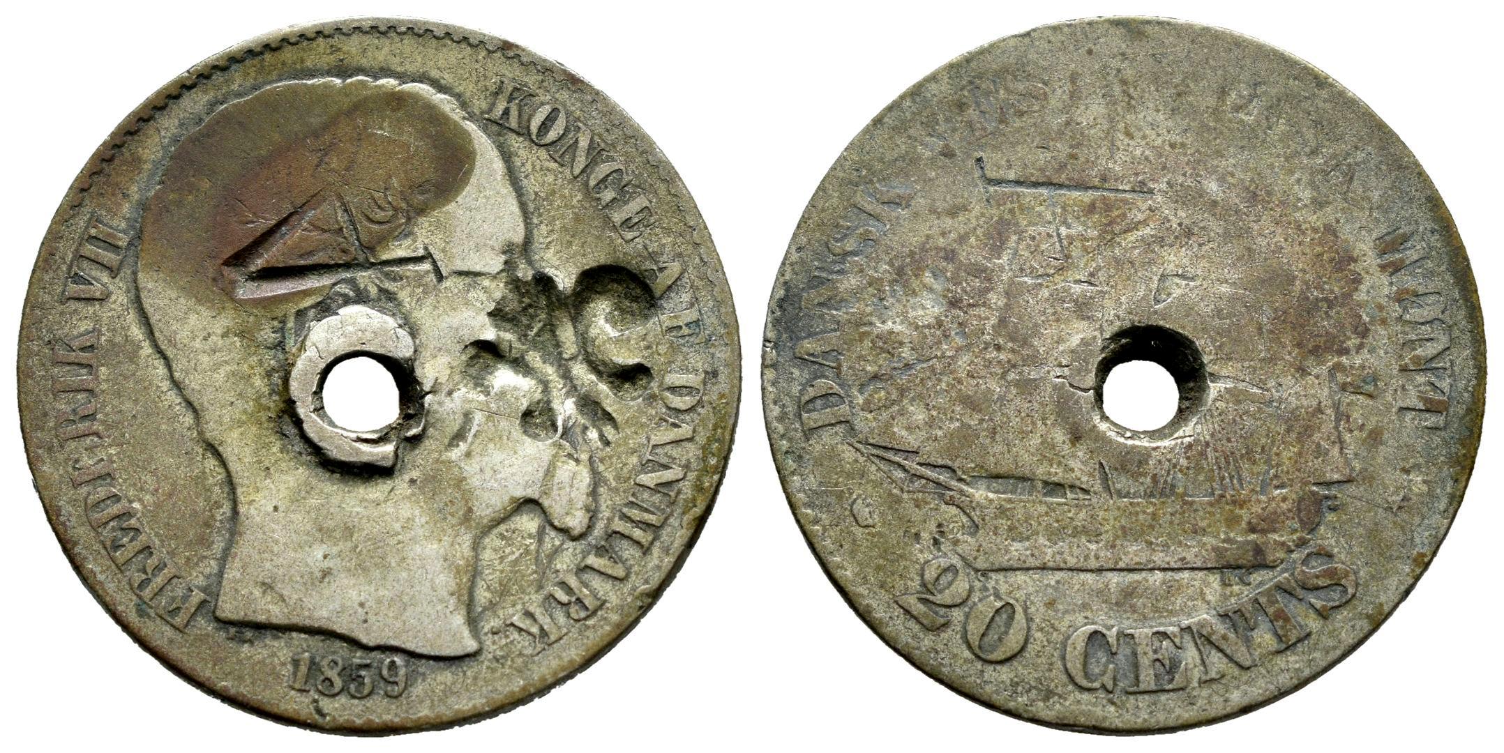 Puerto Rico (Bajo Gobierno de España). Frederik VII. 20 cents. 1869. Indias occidentales Danesas. Ag. 6,65 g. En 1884 ante la necesidad de acuñar moneda, las aduanas de Puerto Rico tomaron monedas extranjeras y las contramarcaron con una flor de lis para su uso en la isla. Acompañado de otras contramarcas privadas. Agujero en el centro. Muy rara. BC. Est...200,00.