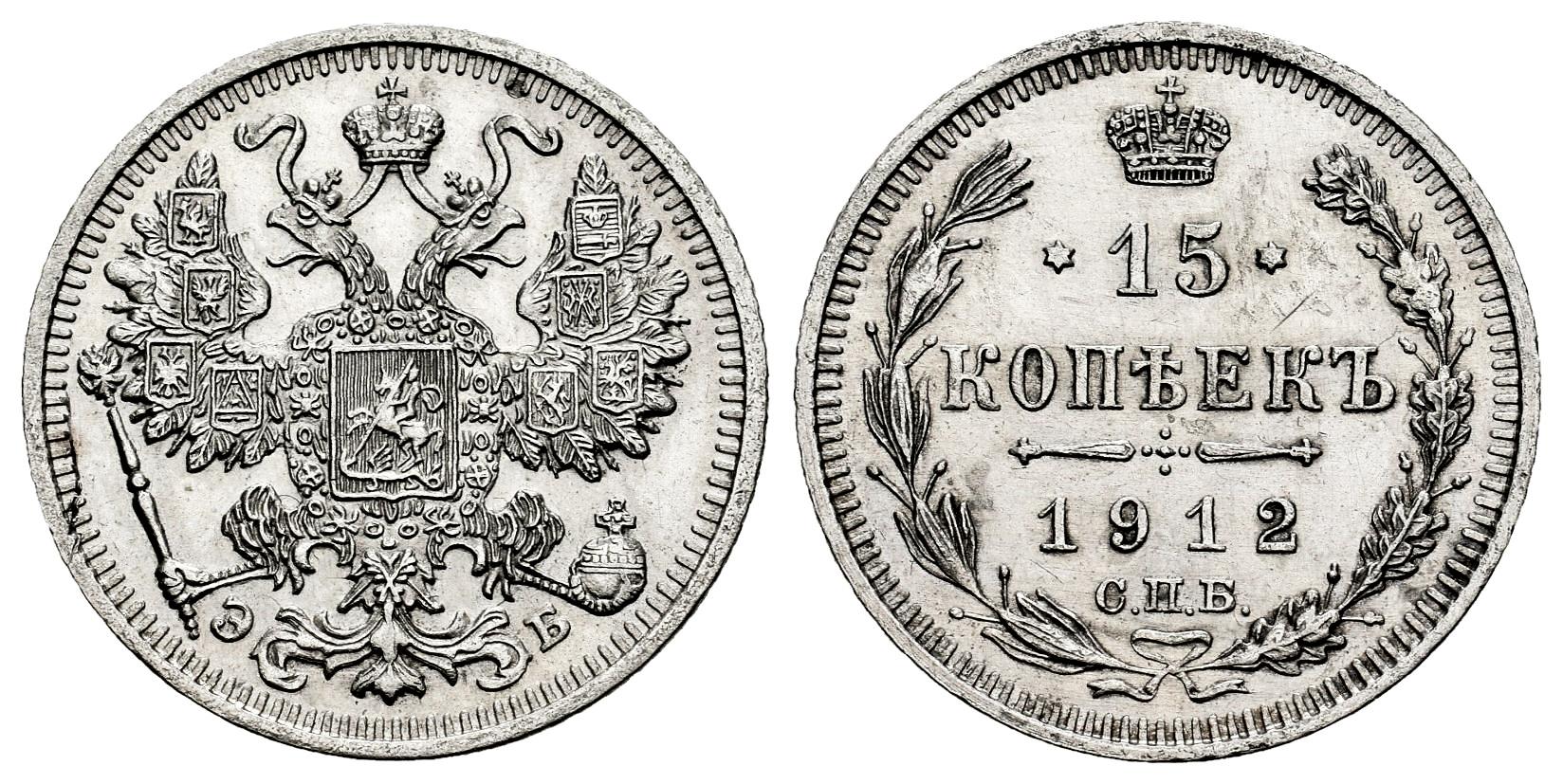 Rusia. Nicholas II (1894-1917). 15 kopecks. 1912. San Petesburgo. СПБ-ЭБ. (Km-Y#21a.2). (Bitkin-137). Ag. 2,63 g. Rayas de limpieza. EBC+. Est...25,00.