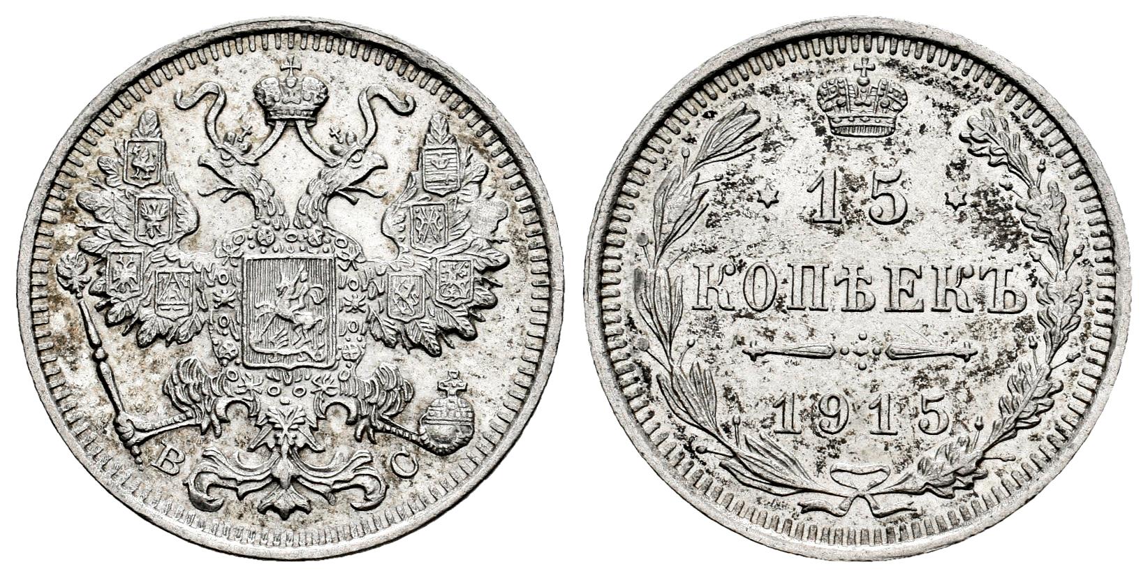 Rusia. Nicholas II (1894-1917). 15 kopecks. 1915. San Petesburgo. СПБ-BC. (Km-Y#21a.2). (Bitkin-142). Ag. 2,61 g. Restos de brillo original. EBC+. Est...25,00.