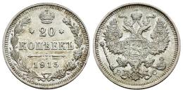 Rusia. Nicholas II (1894-1917). 20 kopecks. 1915. San Petesburgo. СПБ. (Km-Y#22a.2). (Bitkin-117). Ag. 3,56 g. EBC-/EBC. Est...30,00.