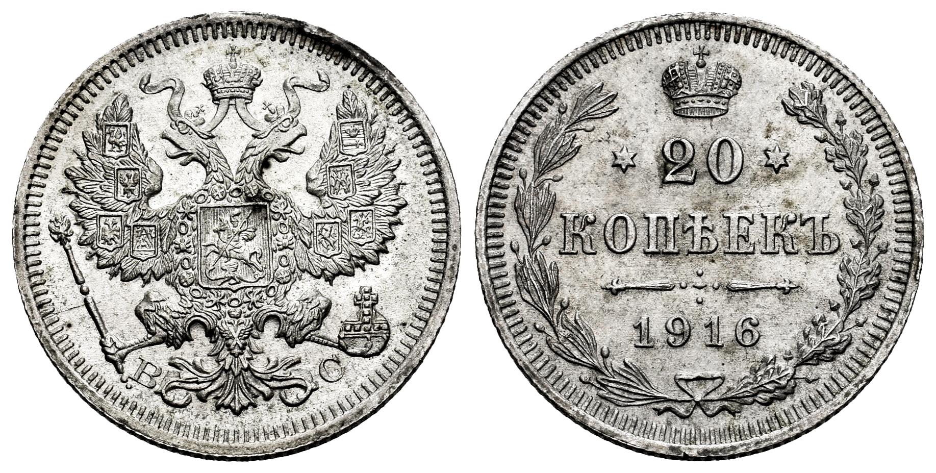 Rusia. Nicholas II (1894-1917). 20 kopecks. 1916. San Petesburgo. CПБ-BC. (Km-Y#22a.2). (Bitkin-118). Ag. 3,69 g. Restos de brillo original. EBC+. Est...30,00.
