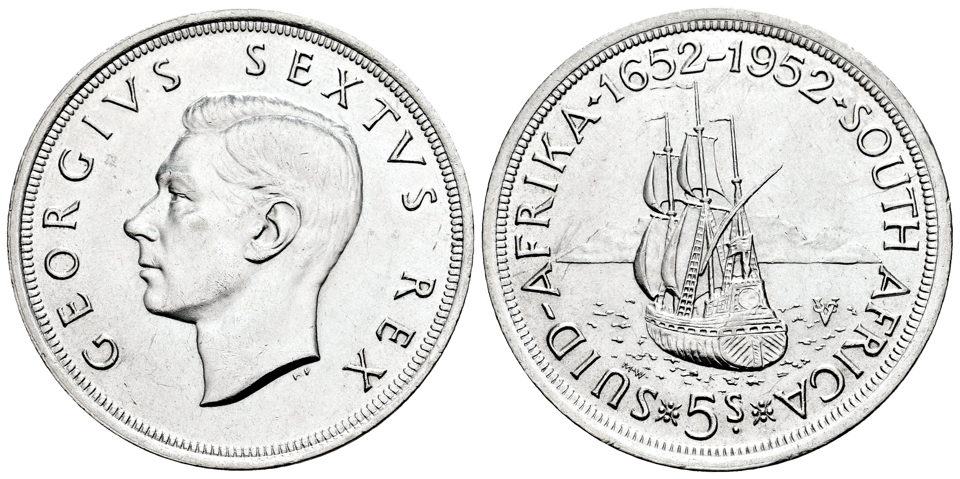 Sudáfrica. George VI. 5 shillings. 1952. (Km-28,33). Ag. 28,32 g. 300 aniversario de la fundación de Ciudad del Cabo. Brillo original. SC. Est...45,00.