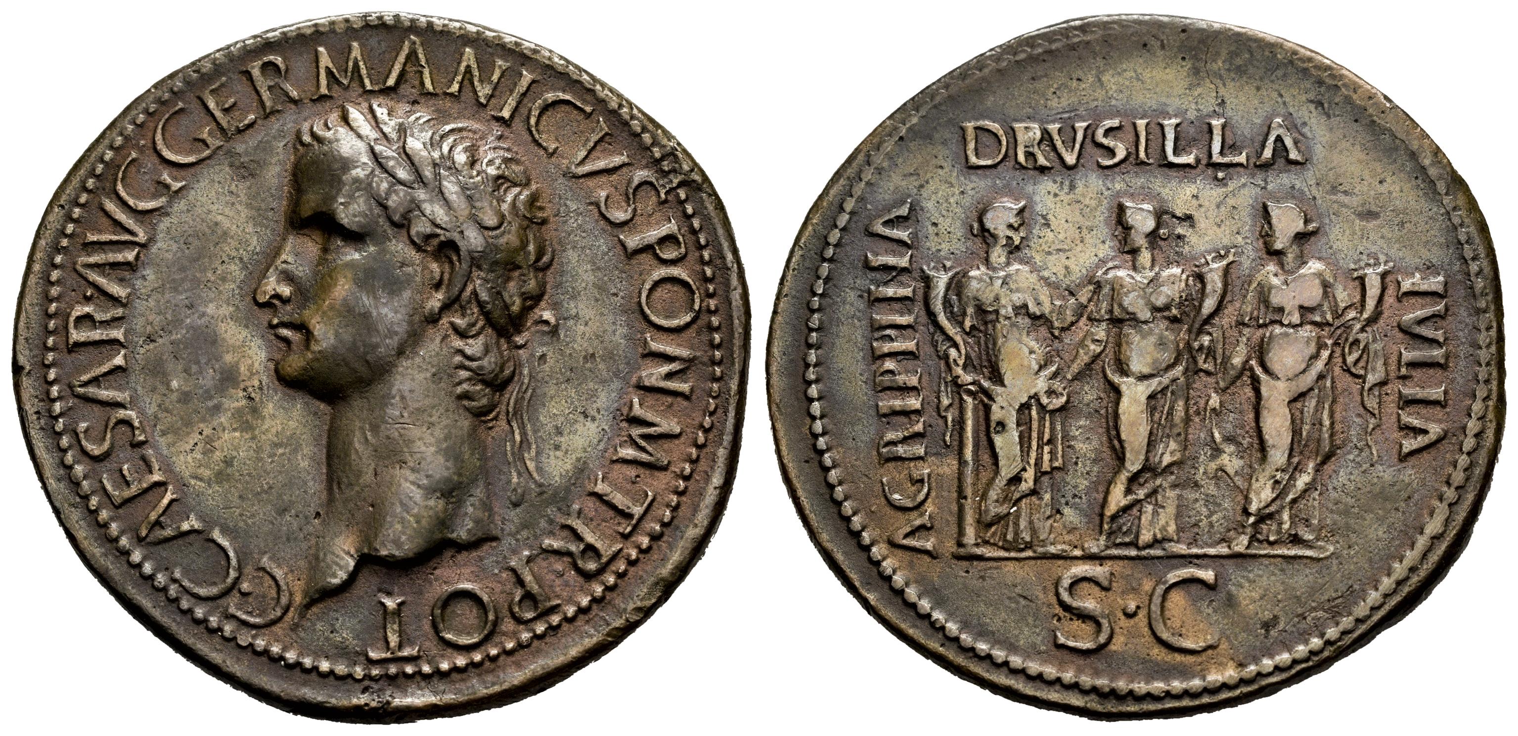 Calígula. Sestercio Paduano. 1600-1900 d.C. Roma. (HMB-I.26). (Klawans-2). (Lawrence-9). Anv.: C • CAESAR • AVG • GERMANICVS • PON • M • TR • POT. Cabeza laureada a izquierda. Rev.: AGRIPPINA DRVSILLA IVLIA. Las tres hermanas de Calígula en pie frente a: Agrippina (como Securitas), apoyada en una columna, sosteniendo cornucopia y colocando la mano en el hombro de Drusilla (como Concordia), que sostiene pátera y cornucopia, mientras que a la derecha Julia (como Fortuna), sostiene timón y cornucopia; S•C en exergo. Ae. 19,24 g. A partir de un original de Giovanni Cavino (1500-1570). MBC+. Est...150,00.