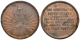 Centenario de la Peseta (1868-1931). Gobierno Provisional (1868-1871). Medalla. ND (1869). Demócratas Republicanos contra la Monarquía. (Vives-827. LXVIII 6). Anv.: Sobre globo terráqueo, sol naciente y balanza coronada por un gorro frigio . Rev.: LOS DEMOCRATAS/ REPUBLICANOS/ PROTESTAN/ CONTRA LA MONARQUIA./ SIRVA ESTE BRONCE/ DE MEMORIA Y ENSEÑA/ AL GRAN PARTIDO. Ae. 12,43 g. Golpe en el reverso. MBC+. Est...45,00.