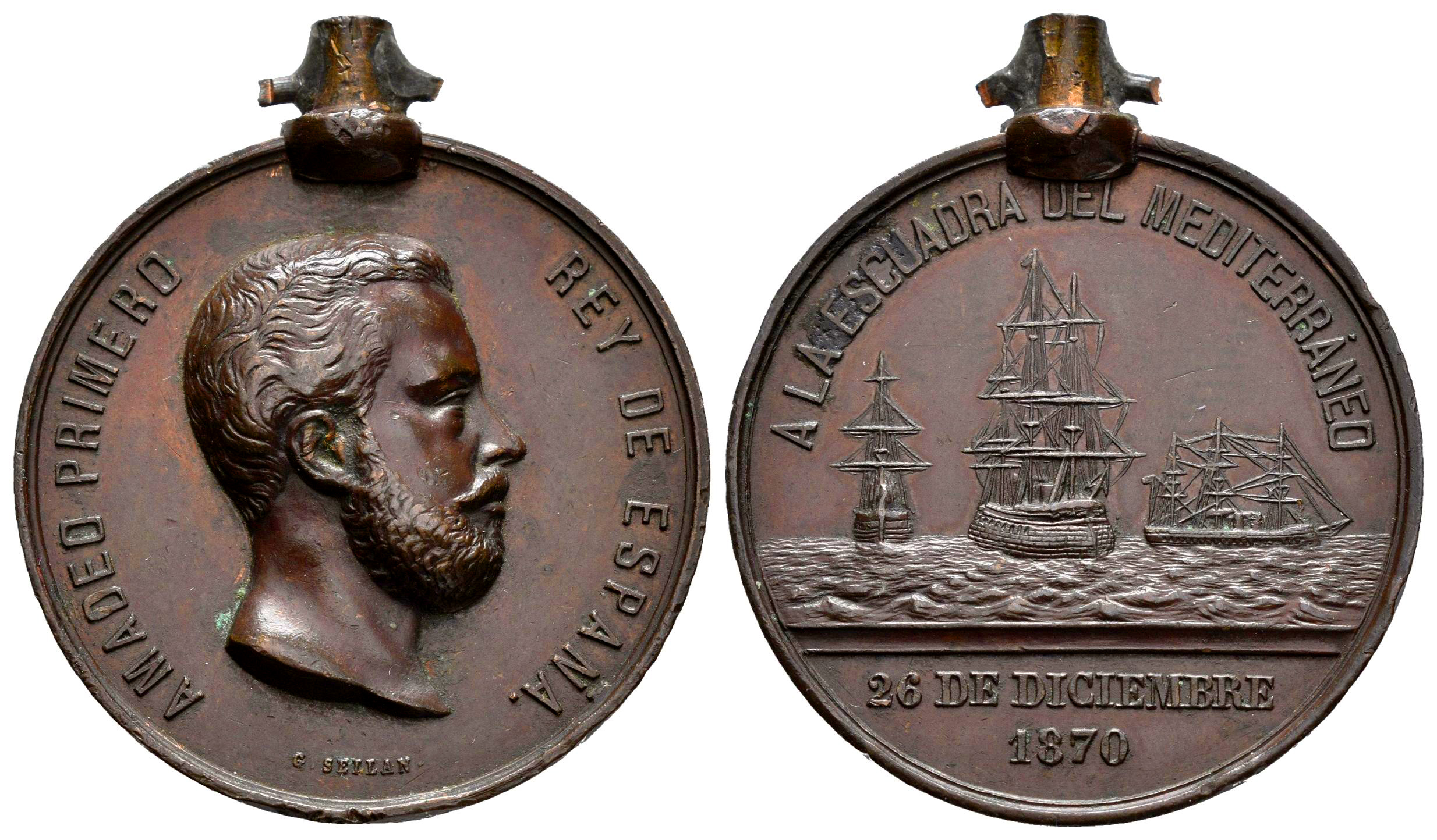 Centenario de la Peseta (1868-1931). Amadeo I (1871-1873). Medalla. 1870. (Vq-14379). Ae. 16,12 g. A la Escuadra del Mediterráneo. 26 de Diciembre de 1870. Con argolla y esta a su vez fracturada. EBC-. Est...90,00.