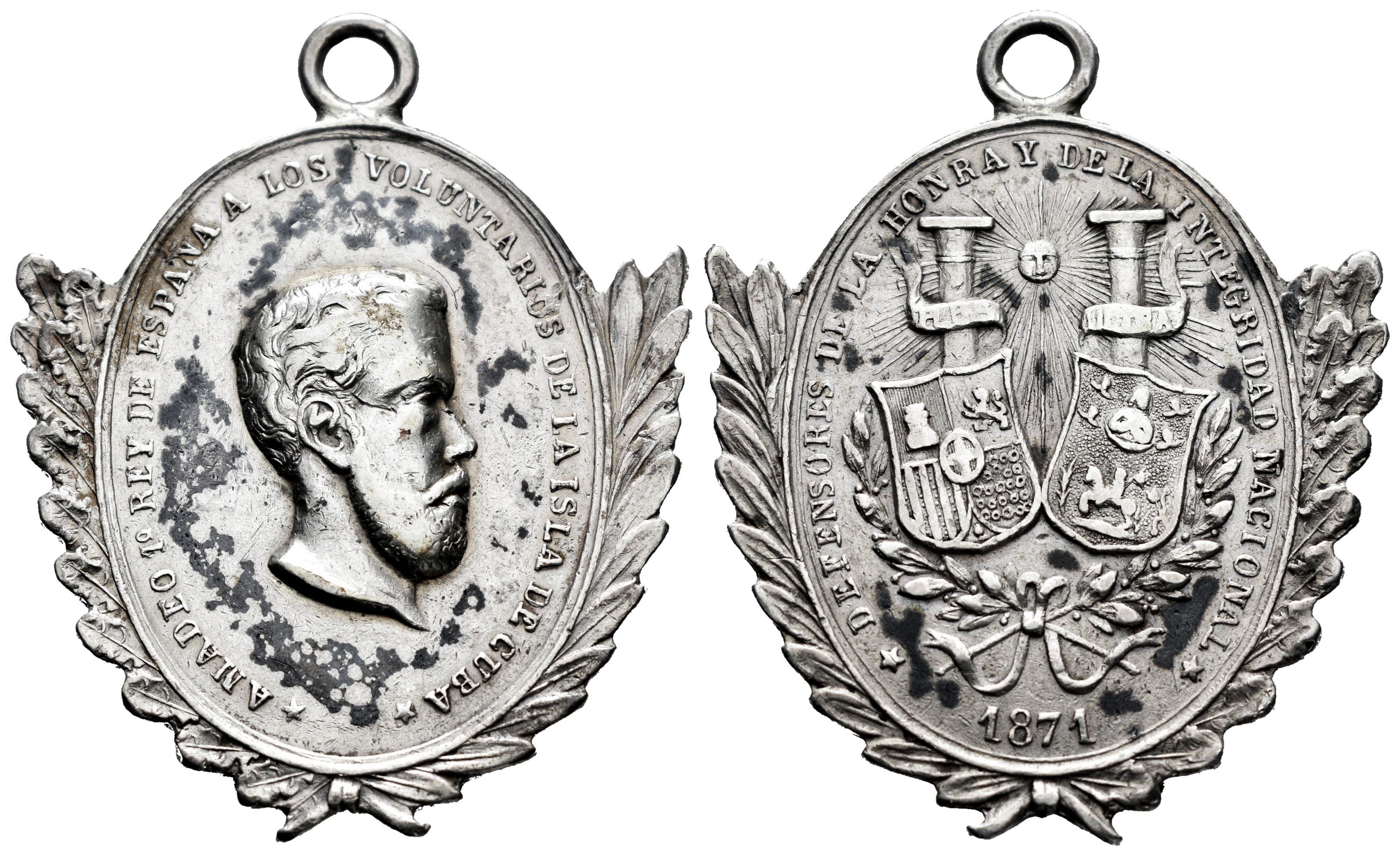 Centenario de la Peseta (1868-1931). Amadeo I (1871-1873). Medalla. 1871. (JLC-198). Ag. 23,83 g. Distinción de los Cuerpos Voluntarios de la Isla de Cuba. Sin corona ni cinta. Suciedad. MBC+. Est...50,00.