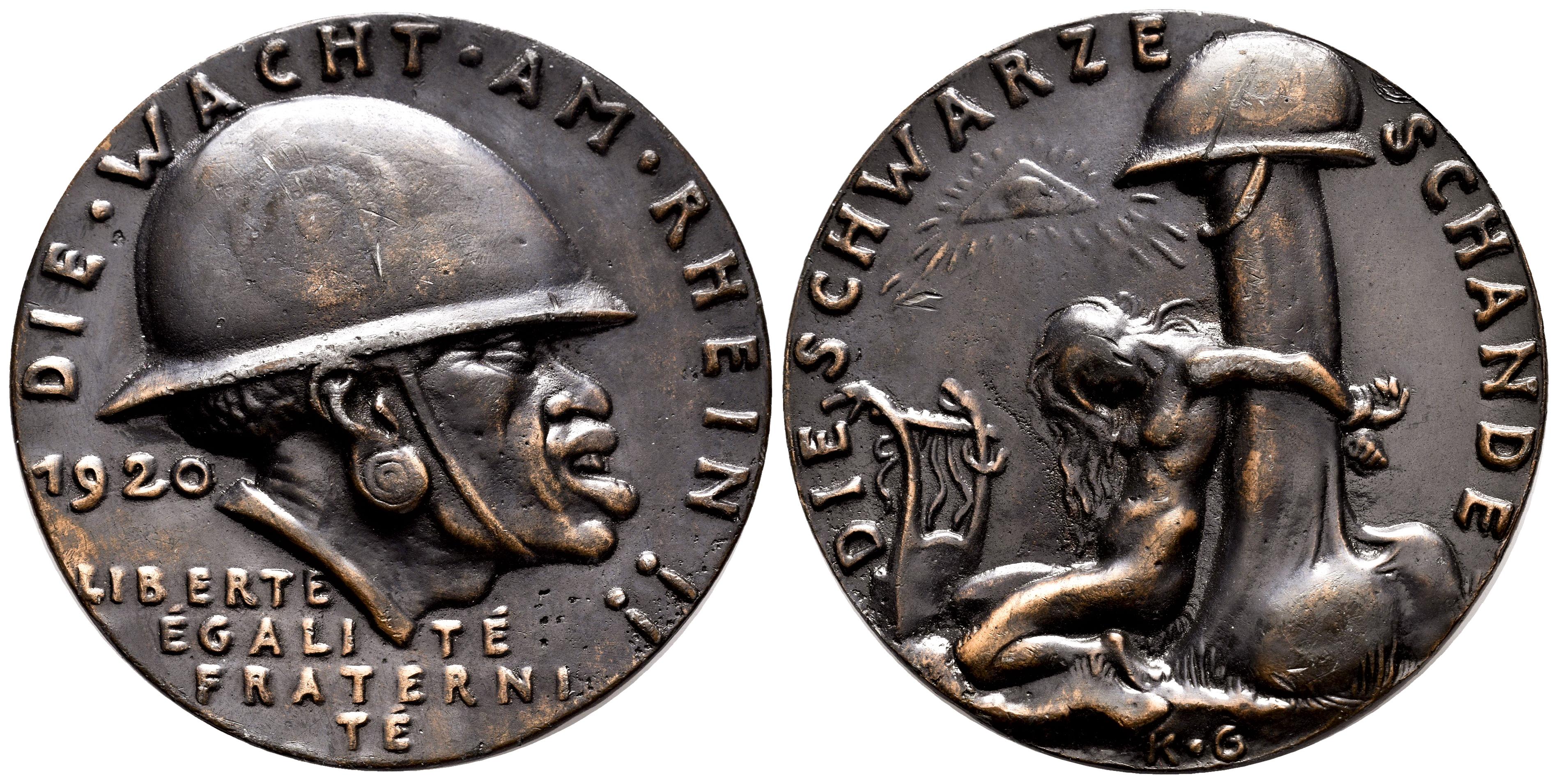 Alemania. República de Weimar. Medalla. 1920. (Kienast-262). Ae. 63,19 g. Cabeza caricaturizada de un soldado colonial africano francés. Por: Karl Goetz. 58 mm. EBC. Est...200,00.