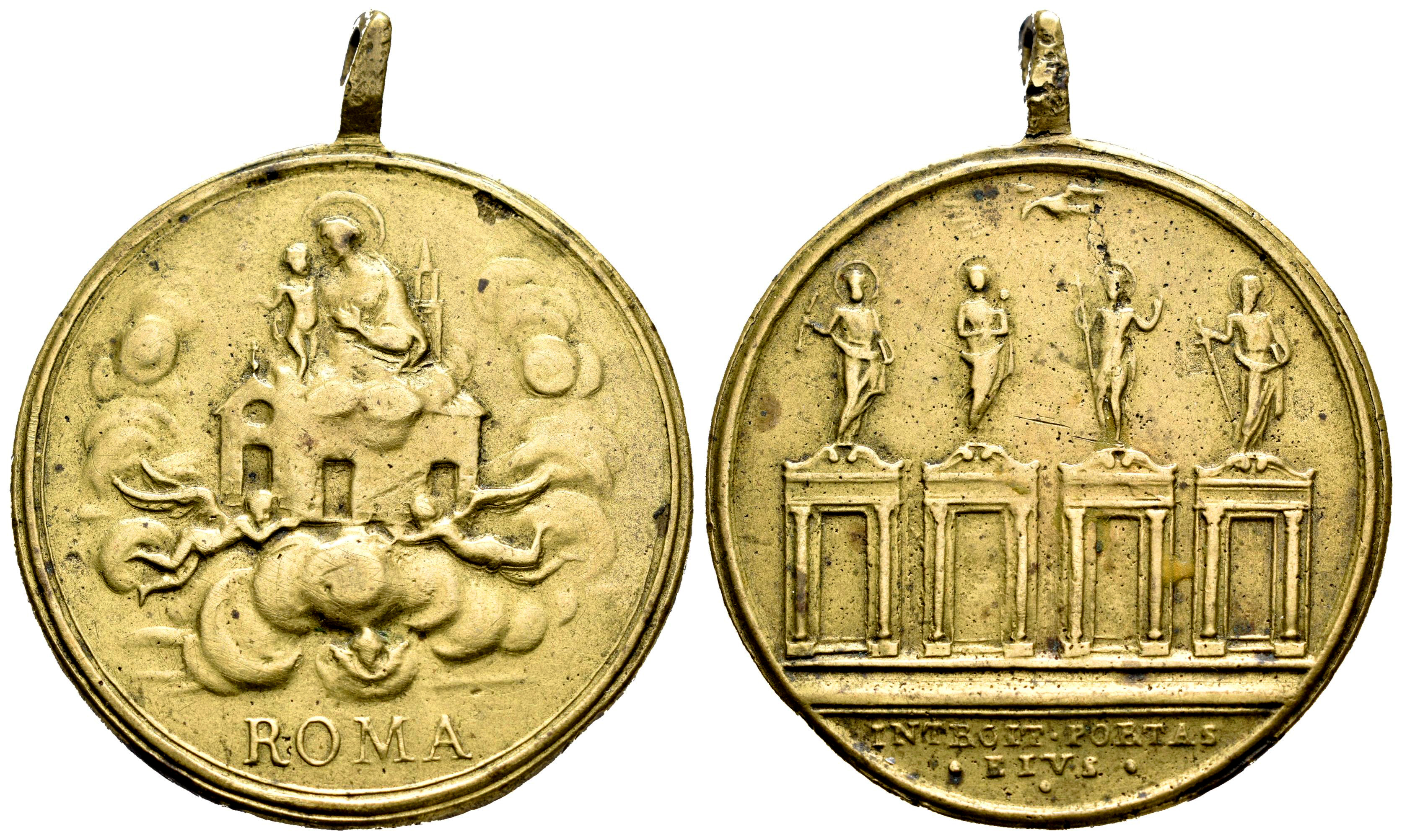 Vaticano. Medalla. Siglo XVIII. Roma. Anv.: Traslación de San Antonio de Padua con niño a la Santa Casa de Nazareth. En exergo Roma. Rev.: Puertas santas de las cuatro basílicas patriarcales romanas, sobremontadas de las efigies de los santos titulares de cada basílica; S. Pedro del Vaticano, Santa María la Mayor, S. Juan de Letrán y S. Pablo Extramuros. En Exergo INTROIT · PORTAS / · EIVS . Ae. 25,30 g. Listel biselado. 45mm. Anilla completa. Muy rara. MBC+. Est...100,00.