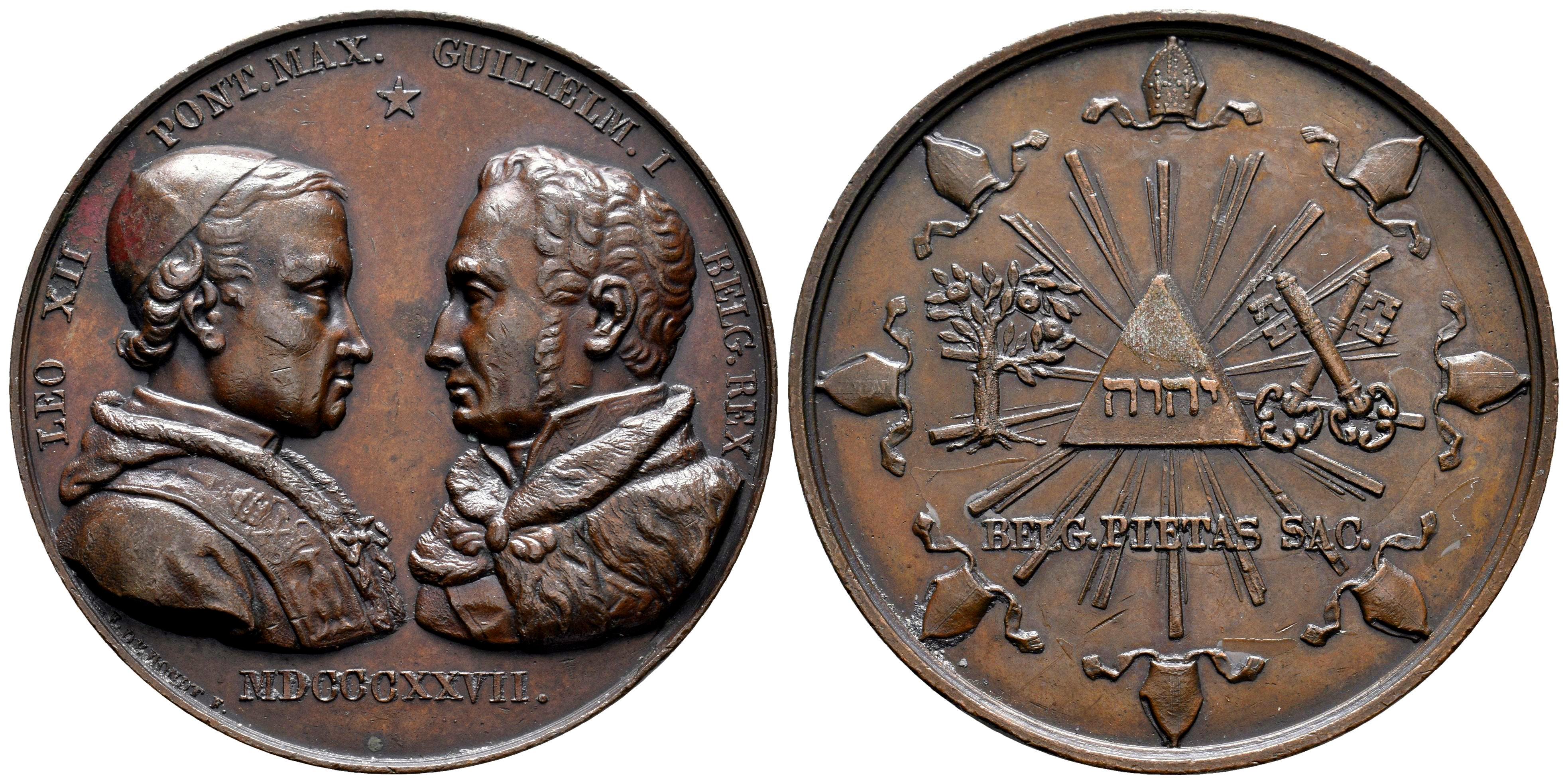 Vaticano. León XII (1823-1829). Medalla. 1827. (Dirks-292). Anv.: LEO XII PONT. MAX. GUILLELM. I GELG. REX. Bustos enfrentados, en exergo MDCCCXXVII.. Rev.: Pirámide radiada de Jehová, entre un arbol y llaves cruzadas, debajo BELG. PIETAS. SAC. Alrededor de 8 mitras. Ae. 52,74 g. Concordato entre Willem I y Leo XII. 47 mm. Leves marquitas. Restos de barniz. EBC-. Est...100,00.
