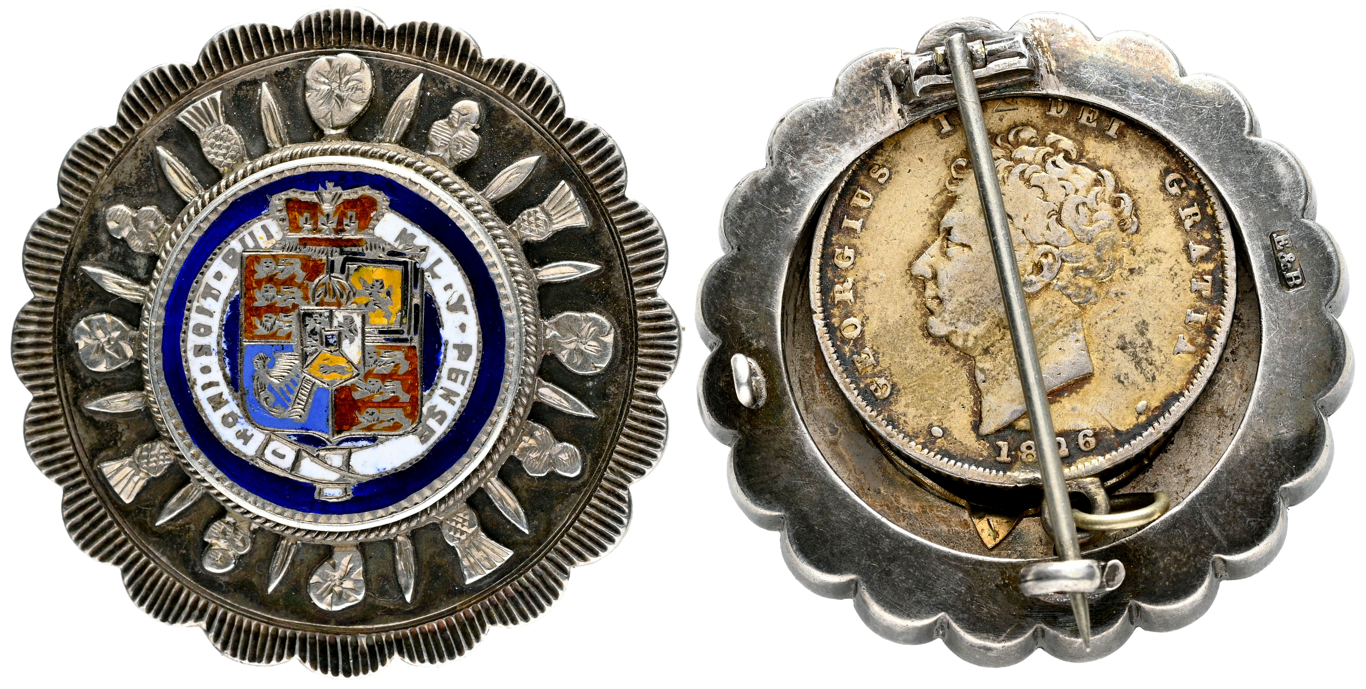 Gran Bretaña. Lote de 2 medallas de Gran Bretaña. Elaboradas a partir de monedas de 1 Shilling, una presenta un reverso esmaltado, dorado y con anilla, mientras que la otra está sobre un broche con anilla para prender, marcada con E&B y montada en un marco muy elaborado con motivos florales, dorado y con reverso esmaltado al frente. Todo realizado en plata (Ag). MBC+. Est...100,00.