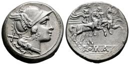 Anónimo. Denario. 200-190 a.C. Sur de Italia. (Ffc-7 var.). (Craw-44/5). (Tesorillo-Anónima 14, mismo ejemplar). Anv.: Cabeza de Roma a derecha, detrás: X. Rev.: Los Dioscuros a caballo a derecha, encima: estrellas,en el exergo: ROMA. Ag. 4,50 g. Ex Gert Boersema, Vcoins (Octubre 2011). EBC. Est...250,00.