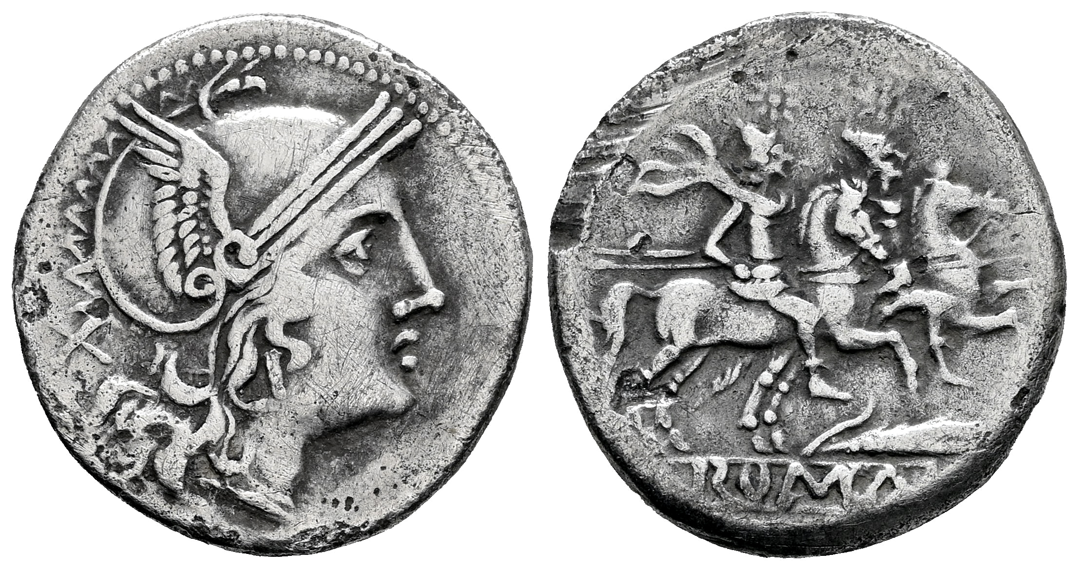 Anónimo. Denario. 211-210 a.C. Sicilia. (Ffc-35). (Craw-72/3). (Tesorillo-Anónima 13, mismo ejemplar). Anv.: Cabeza de Roma a derecha, detrás: X. Rev.: Los Dioscuros a caballo a derecha, encima: estrellas, debajo: espiga de trigo, en el exergo: ROMA, en tablilla. Ag. 4,11 g. MBC. Est...90,00.