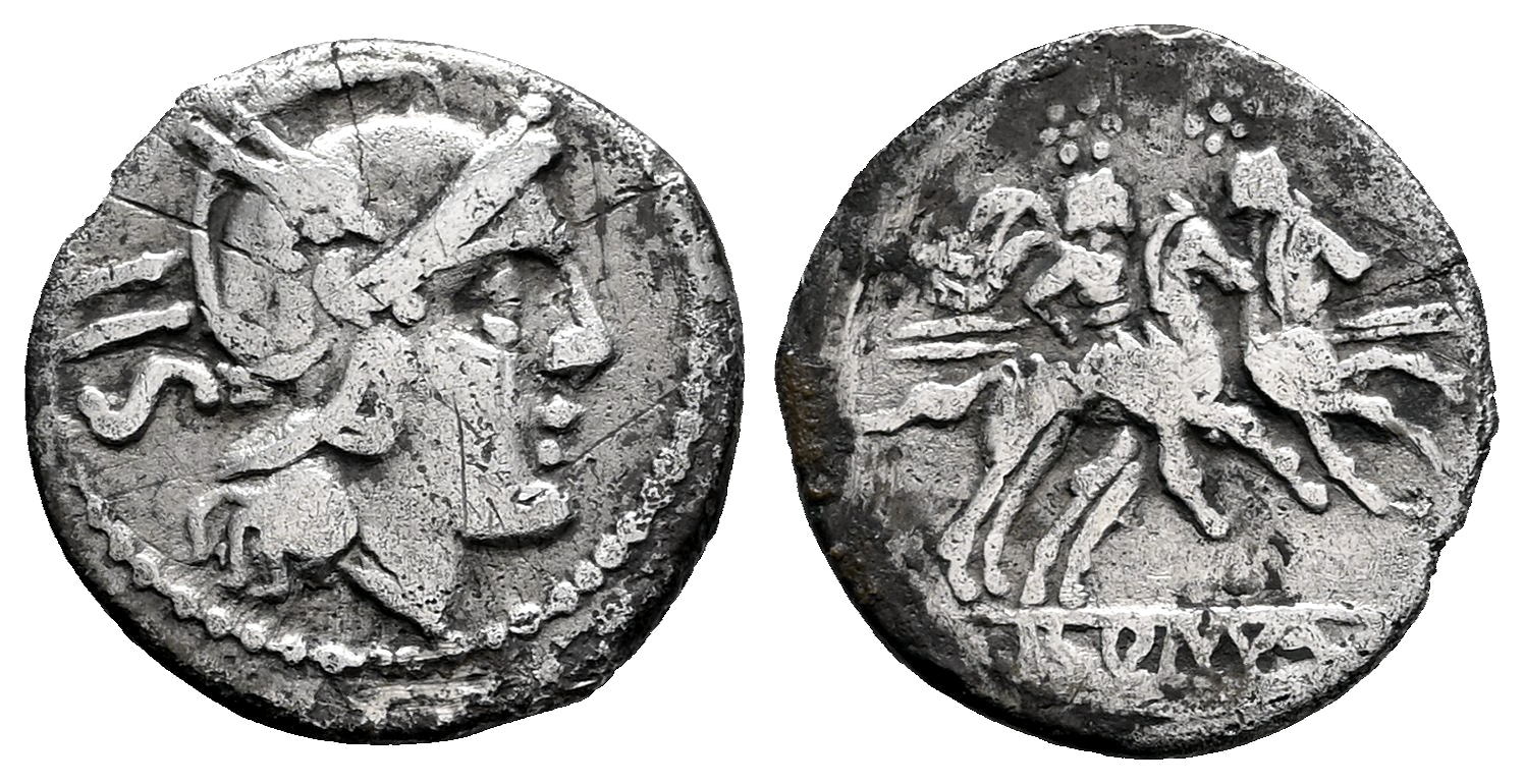 Anónimo. Sestercio. 214-213 a.C. Roma. (Craw-44/7). (BMCRR Rome-13). (Tesorillo-Anónima 10, mismo ejemplar). Anv.: Cabeza con casco de Roma a la derecha; IIS detrás. Rev.: Los Dioscuros, cada uno sosteniendo una lanza, cabalgando a la derecha; ROMA en un marco lineal en el exergo. Ag. 1,02 g. Rayitas y oxidaciones. Rara. Ex Ancient Delights, actualmente Mayor 25. (Mayo 2002). MBC-. Est...80,00.
