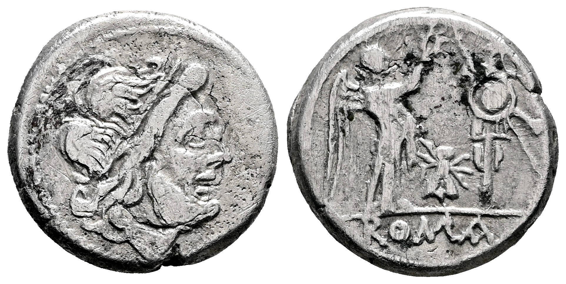 Anónimo. Victoriato. 179-170 a.C. Roma. (Craw-159/1). (Rsc-24g). (Tesorillo-Anónima 28, mismo ejemplar). Anv.: Cabeza laureada de Júpiter a la derecha. Rev.: Victoria en pie a la derecha, coronando un trofeo; mosca entre ellas, ROMA en borde lineal debajo. Ag. 2,73 g. MBC-/MBC. Est...90,00.