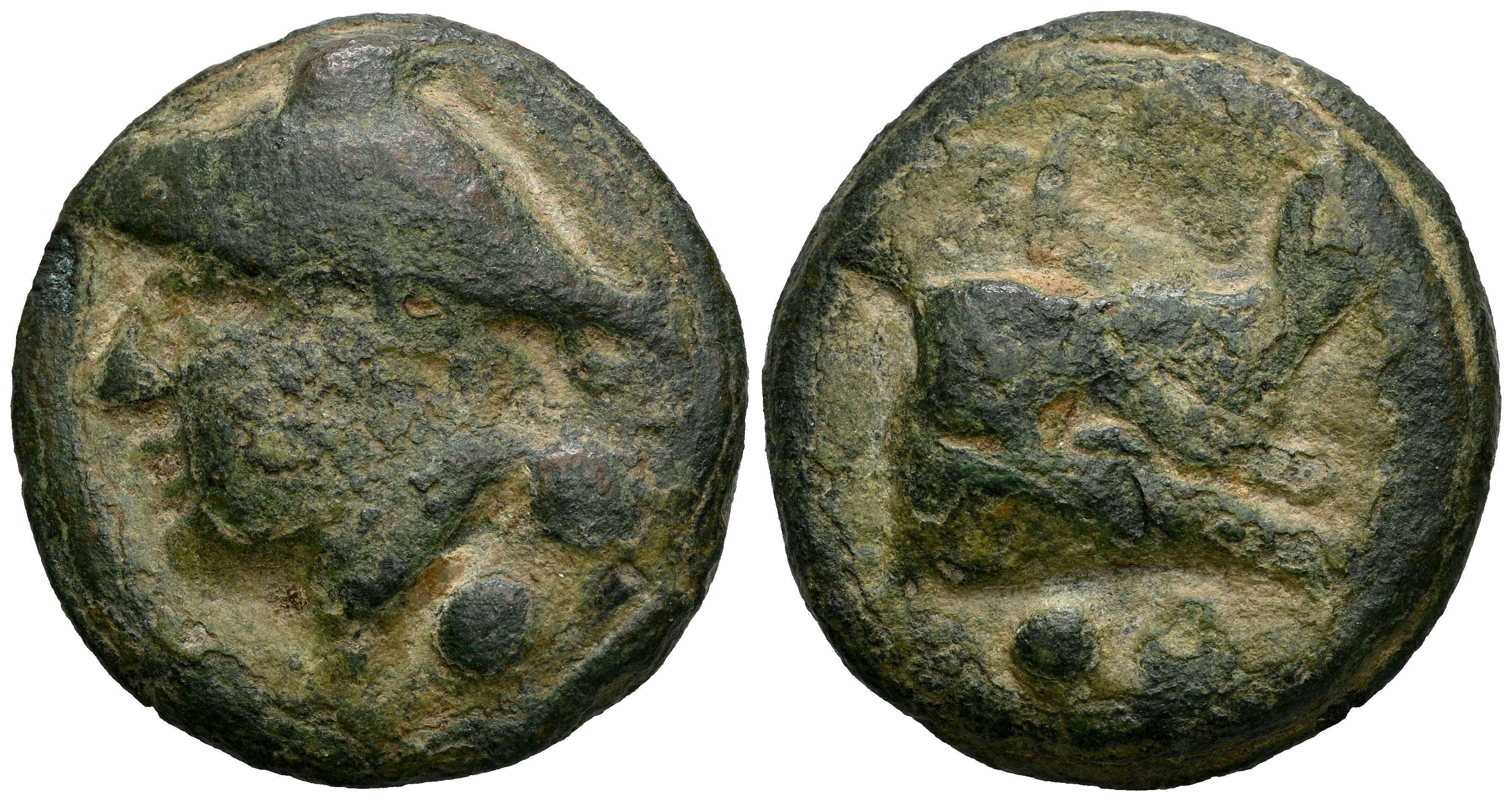 Anónimo. Sextans. 225-217 a.C. Roma. (Craw-35/5). (HN Italy-341). (Tesorillo-Anónima 3, mismo ejemplar). Anv.: Cabeza de Mercurio a la izquierda, con petasus alado; dos puntos (marca de valor) debajo. Rev.: Proa de galera a la derecha; dos puntos (marca de valor) debajo. Ae. 25,36 g. Ex Aeternitas Numismatics. Convención de Madrid (Mayo 2013). MBC. Est...250,00.