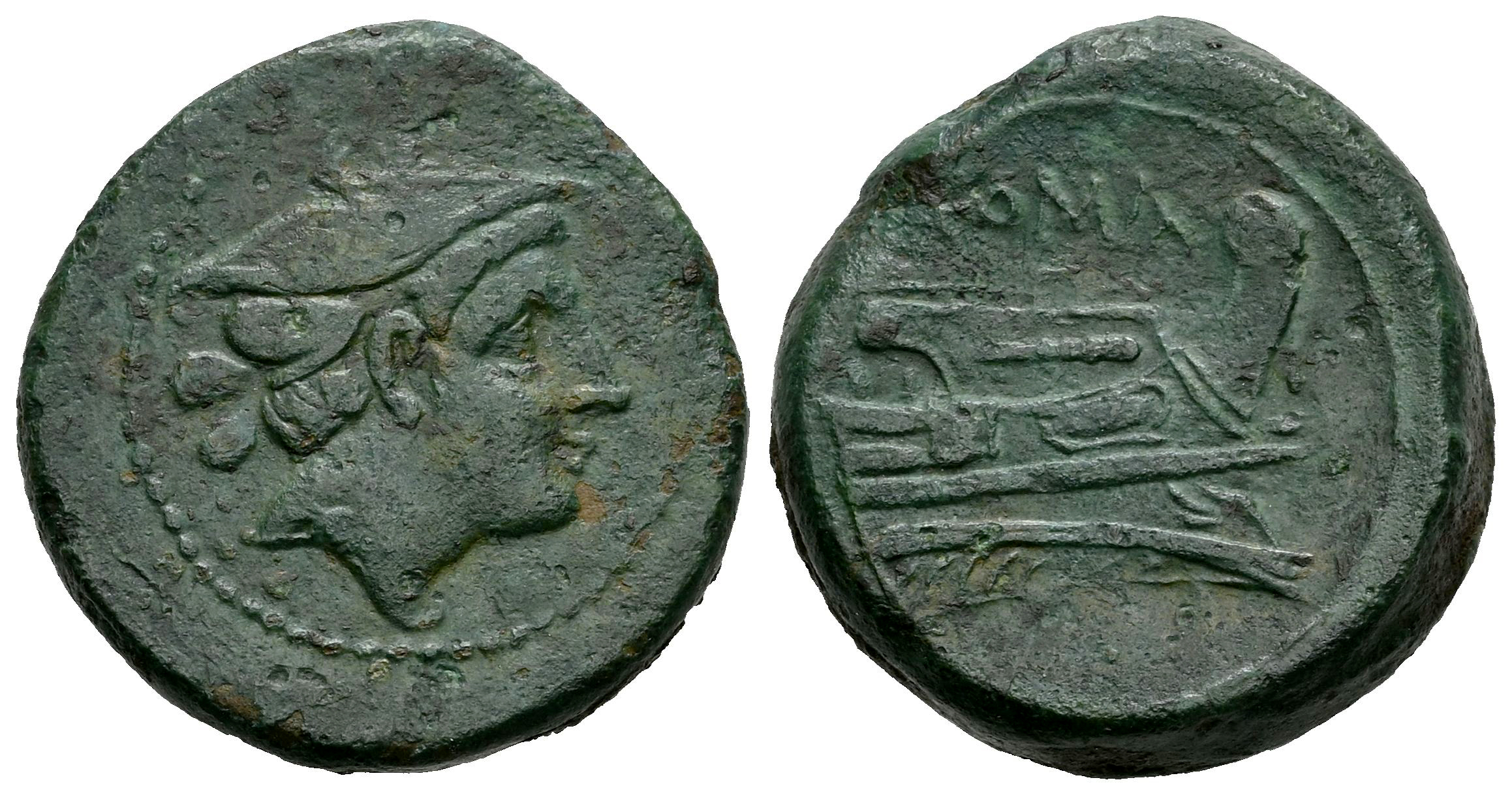 Anónimo. Semiuncia. 217-215 a.C. Roma. (Craw-38/7). (Sydenham-87). (Tesorillo-Anónima 6, mismo ejemplar). Anv.: Cabeza de Mercurio a la derecha, con petasus alado. Rev.: ROMA. Proa de galera a la derecha. Ae. 7,99 g. Ex J. Sermarini, Forum Ancient Coins (Agosto 2003), lote 5565. Conserva la etiqueta original. MBC. Est...100,00.
