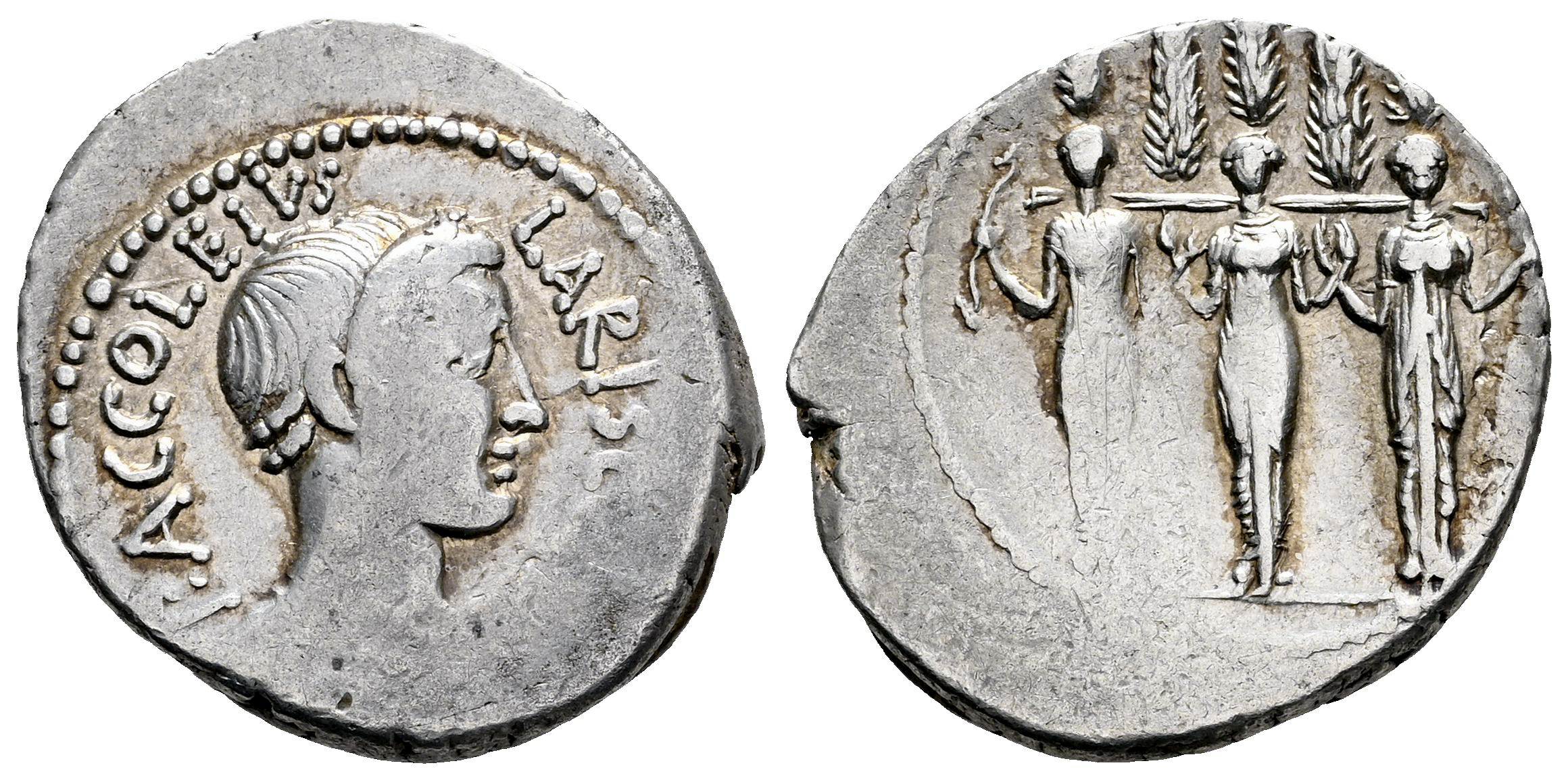 Accoleia. P. Accoleius Lariscolus. Denario. 43 a.C. Roma. (Ffc-90). (Craw-486/1). (Tesorillo-Accoelia 1, mismo ejemplar). Anv.: Busto de Acca Larentia a derecha, P. ACCOLEIVS SARISC(OLVS). Rev.: Las tres estatuas de "Nymphae Querquetulanae" en forma de cariátides, sosteniendo una barra horizontal de la que emergen cinco arbustos. Ag. 3,80 g. Ligero tono. Atractiva. Ex J. Vico 107 (03/03/2005), lote 3146. Conserva la etiqueta original. MBC-/MBC+. Est...140,00.