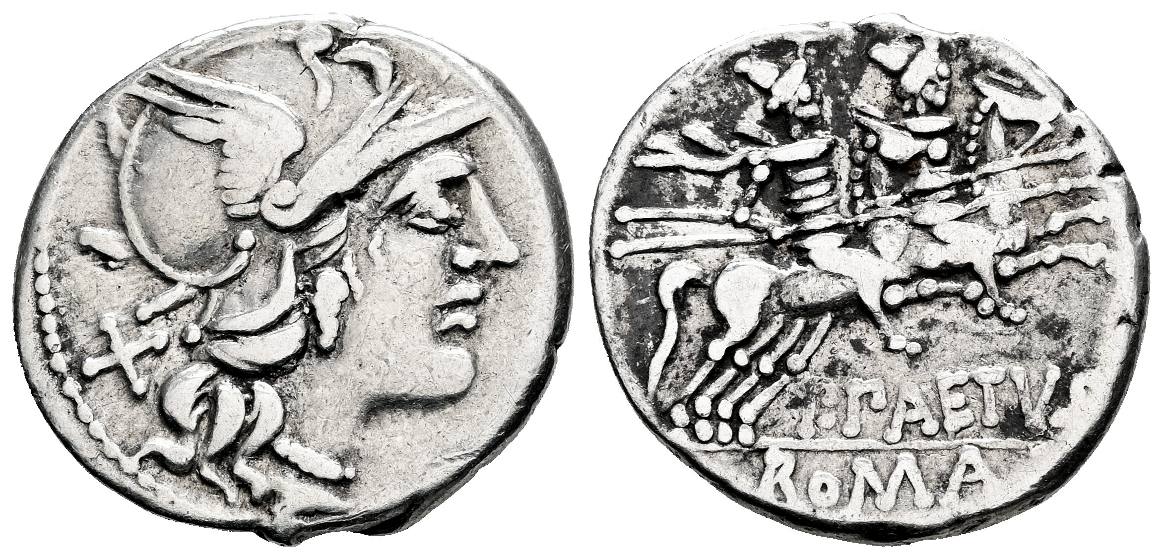 Aelia. P. Aelius Paetus. Denario. 138 a.C. Taller Auxiliar de Roma. (Ffc-99). (Craw-233/1). (Tesorillo-Aelia 1, mismo ejemplar). Anv.: Cabeza de Roma a derecha, detrás: X. Rev.: Los Dioscuros a caballo a derecha, encima: estrellas,debajo: P. PAETVS., en el exergo: ROMA, en tablilla. Ag. 3,83 g. Ex J. Vico (Junio 2002), lote 1133. MBC. Est...90,00.