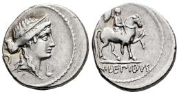 Aemilia. M. Aemilius Lepidus. Denario. 61 a.C. Roma. (Ffc-104). (Craw-419/1d). (Tesorillo-Aemilia 5, mismo ejemplar). Anv.: Cabeza diademada de Roma a derecha, delante: símpulo, detrás: corona. Rev.: Estatua ecuestre de Marcus Lepidus a derecha llevando un trofeo,en el exergo. M. LEPIDVS. Ag. 3,77 g. Ex Calgary Coins, Vcoins (Octubre 2007). MBC+. Est...300,00.