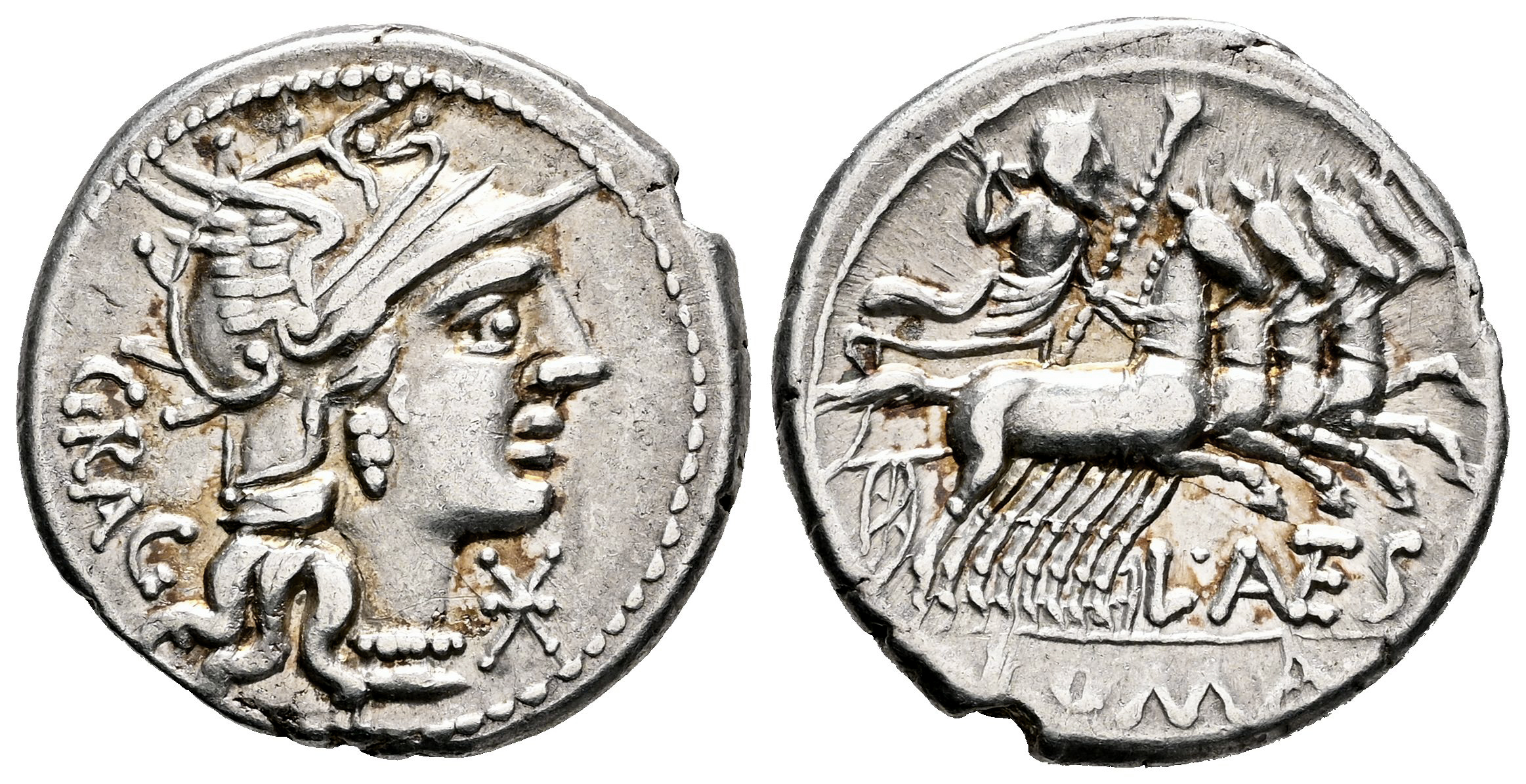 Antestia. L. Antestius Gragulus. Denario. 136 a.C. Roma. (Ffc-151). (Craw-238/1). (Tesorillo-Antestia 2, mismo ejemplar). Anv.: Cabeza de Roma a derecha, delante: X, detrás: GRAG.. Rev.: Júpiter en cuadriga a derecha con cetro y haz de rayos, debajo: L. ANTES, (ANTE entrelazadas), en el exergo: ROMA. Ag. 3,77 g. Ligero tono. Bella. EBC-/MBC+. Est...150,00.