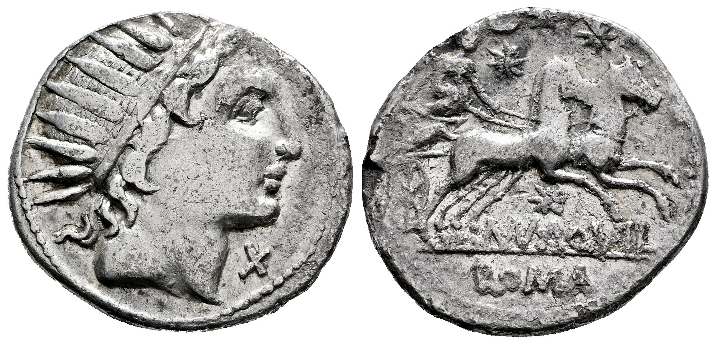Aquillia. Man Aquillius. Denario. 109-108 a.C. Sur de Italia. (Ffc-166). (Craw-303/1). (Tesorillo-Aquillia 1, mismo ejemplar). Anv.: Cabeza radiada del Sol a derecha, delante: X. Rev.: Diana en biga a derecha, en el campo cuatro estrellas y luna, debajo: MN. AQUIL. (MN entrelazada), en el exergo: ROMA. Ag. 2,70 g. Ex AncientCoinArt.com (Septiembre 2003), lote 1037. Conserva la etiqueta original. MBC/MBC-. Est...120,00.