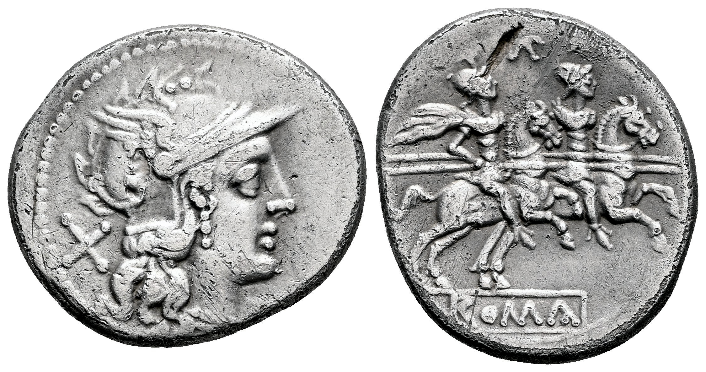 Baebia. C. Baebius Tampilus. Denario. 194-190 a.C. Roma. (Ffc-195). (Craw-133/2b). (Tesorillo-Baebia 1, mismo ejemplar). Anv.: Cabeza de Roma a derecha, detrás: X. Rev.: Los Dioscuros a caballo a derecha, encima: estrellas,encima: TAMP., (todas las letras entrelazadas), en el exergo: ROMA, en tablilla. Ag. 3,76 g. Fallo de acuñación en el reverso. Escaso. MBC/MBC+. Est...100,00.