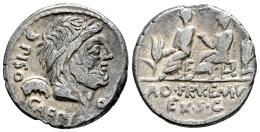 Calpurnia. L. Calpurnius Piso y Q. Sevilius Caepius. Denario. 100 a.C. Taller Auxiliar de Roma. (Ffc-227). (Craw-330/1b). (Tesorillo-Calpurnia 1, mismo ejemplar). Anv.: Cabeza laureada de Saturno a derecha, detrás: arpa, encima: símbolo, PISO. CAEPIO.Q. Rev.: Los dos questores Piso y Caepio sentados a izquierda. entre dos espigas, en el exergo: AD.FRV.EMV./EX. SC. Ag. 3,78 g. Ex Ancient Delights, actualmente Mayor 25. Convención de Madrid (Julio 2004). MBC. Est...90,00.