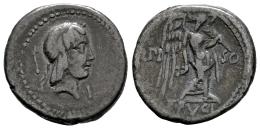Calpurnia. L. Calpurnius Piso Frugi. Quinario. 90 a.C. Roma. (Craw-340/2e). (Rsc-Calpurnia 13b). (Tesorillo-Calpurnia 4, mismo ejemplar). Anv.: Cabeza laureada de Apolo a la derecha; lanza detrás, letra I delante. Rev.: Victoria en pie a la derecha, sosteniendo una corona en la mano derecha abajo y palma sobre el hombro con la izquierda; L•PI-SO a través de los campos, FRVGI debajo. Ag. 1,84 g. Suave pátina. Ex Pavlos S. Pavlou. Vcoins (Octubre 2007). Conserva etiqueta del coleccionista. MBC. Est...120,00.