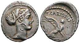 Carisia. T. Carisius. Denario. 46 a.C. Roma. (Ffc-552). (Craw-464/1). (Tesorillo-Carisia 1, mismo ejemplar). Anv.: Cabeza de Sivila a derecha. Rev.: Esfinge sentada a derecha, encima y detrás: T. CARISIVS., en el exergo: (III. VIR). Ag. 3,47 g. Marcas de banquero en anverso y leves rayitas en reverso. Bonito tono dorado. Ex J. Vico 107 (03/03/2005), lote 3166. Conserva la etiqueta original. EBC-/MBC+. Est...120,00.