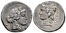Cassia. L. Cassius Q.f. Longinus. Denario. 78 a.C. Roma. (Ffc-556). (Craw-386/1). (Tesorillo-Cassia 3, mismo ejemplar). Anv.: Cabeza de Libero Baco a derecha, coronada de liras, detrás: tirso. Rev.: Cabeza diademada de Libera a izquierda, detrás: L. CASSI. Q. F. Ag. 3,92 g. Marca de banquero en anverso. Restos de brillo original. Ex J. A. Herrero (15/12/2011), lote 219. Conserva la etiqueta original. EBC. Est...300,00.