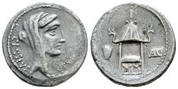 Cassia. Q. Cassius Longinus. Denario forrado. 55 a.C. Roma. (Ffc-558). (Craw-528/1). (Tesorillo-Cassia 5, mismo ejemplar). Anv.: Cabeza velada y diademada de Vesta a derecha,Q. CASSIVS VEST. Rev.: Silla curul bajo templo de Vesta, copulado y coronado por una figura de pie con cetro y patera, a izquierda: urna de votos, a derecha: boletín con la inscripción: AC. Ae/Ag. 3,49 g. Conserva casi en su totalidad la envoltura de plata y apenas dejando ver, salvo en mínimos puntos, su alma de cobre. Ex Ancient Delights, actualmente Mayor 25. Convención de Madrid (Julio 2004). MBC. Est...120,00.