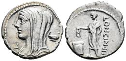 Cassia. L. Cassius Longinus. Denario. 55 a.C. Roma. (Ffc-561). (Craw-413/1). (Tesorillo-Cassia 4, mismo ejemplar). Anv.: Busto velado de Vesta a izquierda, detrás copa, delante letra. Rev.: Ciudadano romano a izquierda votando, en la papeleta se ve una V (Vti Rogas) Ley./detrás: LONGIN. IIIV. Ag. 3,56 g. EBC/EBC-. Est...250,00.
