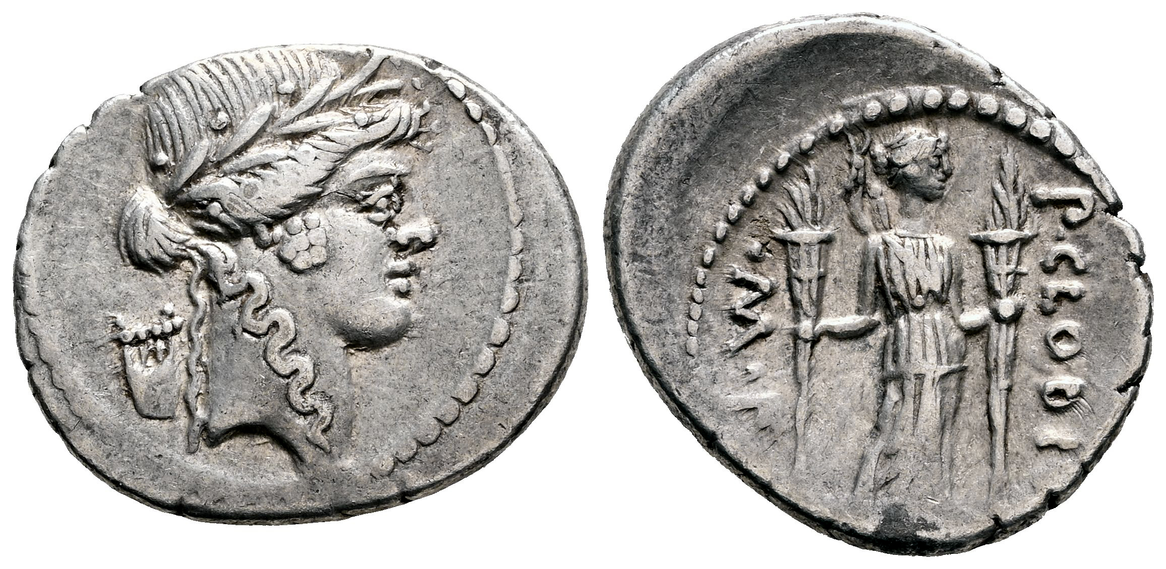 Claudia. P. Claudius M.f. Turrinus. Denario. 42 a.C. Roma. (Ffc-569). (Craw-494/23). (Tesorillo-Claudia 5, mismo ejemplar). Anv.: Cabeza laureada de Apolo a derecha, detrás: lira. Rev.: Diana Lucífera de pie a derecha, con dos largas antorchas en sus manos, P. CLODI(VS). M.F. Ag. 3,75 g. Ex AncientCoinArt.com (Septiembre 2003), lote 1701 Conserva la etiqueta original. MBC+. Est...120,00.