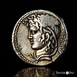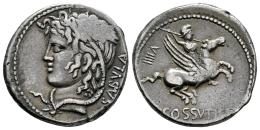 Cossutia. L. Cossutius C.f. Sabula. Denario. 74 a.C. Roma. (Ffc-655). (Craw-395/1). (Tesorillo-Cossutia 1, mismo ejemplar). Anv.: Cabeza alada de Medusa a izquierda, detrás: SABVLA. Rev.: Ballerophon montando Pegaso a derecha, a izquierda número VIIII,debajo: L. COSSVTL (C.F). Ag. 3,80 g. Suave pátina. Ex J. Vico 107 (03/03/2005), lote 111. Conserva la etiqueta original. MBC+. Est...300,00.