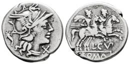 Cupiennia. L. Cupiennius. Denario. 147 a.C. Roma. (Ffc-665). (Craw-218/1). (Tesorillo-Cupiennia 1, mismo ejemplar). Anv.: Cabeza de Roma a derecha, delante X., detrás: cuerno de la abundancia. Rev.: Los Dioscuros a caballo a derecha, encima: estrellas,debajo: L. CVP. (VP entrelazadas), en el exergo: ROMA, en tablilla. Ag. 3,93 g. Ex J. Vico (Marzo 2002), lote 1183. MBC-. Est...85,00.