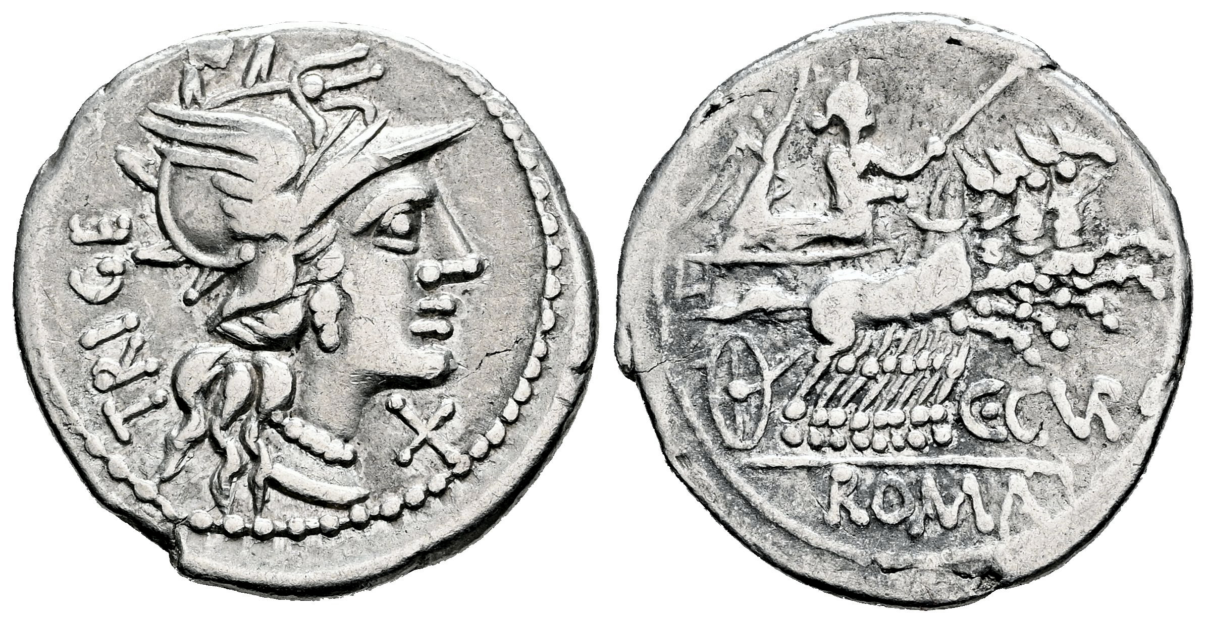 Curiatia. Caius Curiatius Trigéminos. Denario. 142 a.C. Roma. (Ffc-666). (Craw-223/1). (Tesorillo-Curiatia 1, mismo ejemplar). Anv.: Cabeza de Roma a derecha, delante: X, detrás: TRIGE. Rev.: Juno con cetro en cuadriga a derecha, coronado por Victoria, debajo: C. CVR. (VR entrelazadas), en el exergo: ROMA. Ag. 3,51 g. MBC+/MBC-. Est...90,00.