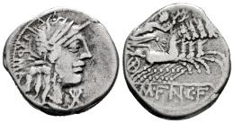 Fannia. Mareius Fannius C.f. Denario. 123 a.C. Taller Auxiliar de Roma. (Ffc-705). (Craw-275/1). (Tesorillo-Fannia 1, mismo ejemplar). Anv.: Cabeza de Roma a derecha, delante: X, detrás: ROMA. Rev.: Victoria con corona en cuadriga a derecha, en el exergo: M. FAN. C.F., (AN entrelazadas). Ag. 3,76 g. Ex J. Vico (Junio 2002), lote 1196. MBC-. Est...80,00.