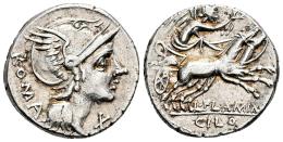 Flaminia. Lucius Flaminius Cilo. Denario. 109-108 a.C. Norte de Italia. (Ffc-708). (Craw-302/1). (Tesorillo-Flaminia 1, mismo ejemplar). Anv.: Cabeza de Roma a derecha, delante: X,detrás: ROMA. Rev.: Victoria con corona, en biga a derecha,debajo: L. FLAMINI, en el exergo: CILO. Ag. 3,87 g. Tono iridiscente. Bella. EBC-. Est...150,00.