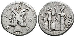 Furia. M. Furius L.f. Philus. Denario. 119 a.C. Italia Central. (Ffc-730). (Craw-281/1). (Tesorillo-Furia 1, mismo ejemplar). Anv.: Cabeza de Jano bifonte,M. FOVRI. L.F. Rev.: Roma de pie a izquierda, coronando un trofeo a cuyos lados hay dos escudos y dos carnyx, a derecha: ROMA., en el exergo: PHILI. Ag. 3,72 g. Rayitas en anverso. Adquirida a un comerciante de antiguedades. Hartford, Conneticut (Agosto 2001). MBC-. Est...90,00.