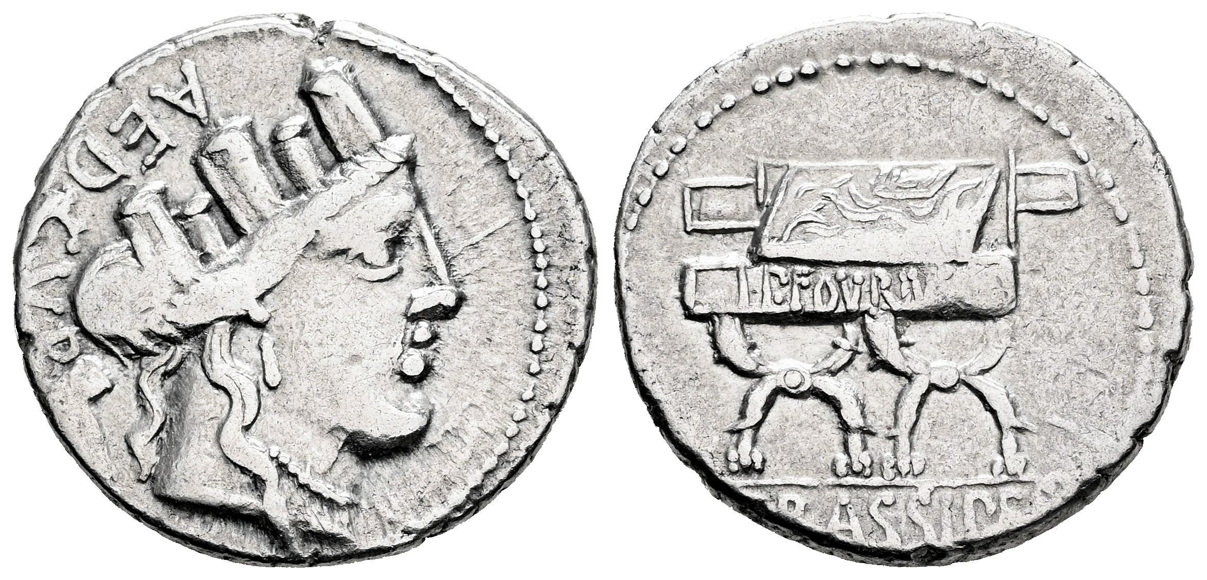 Furia. P. Furius Crassipes. Denario. 84 a.C. Taller Auxiliar de Roma. (Ffc-732). (Craw-356/1c). (Tesorillo-Furia 3, mismo ejemplar). Anv.: Cabeza con corona mural de Cibeles a derecha, detrás pie humano hacia abajo, AED. CVR. Rev.: Silla curul, conteniendo la inscripción: P. FOVRIVS, en el exergo: CRASSIPES. Ag. 4,02 g. MBC/MBC+. Est...100,00.